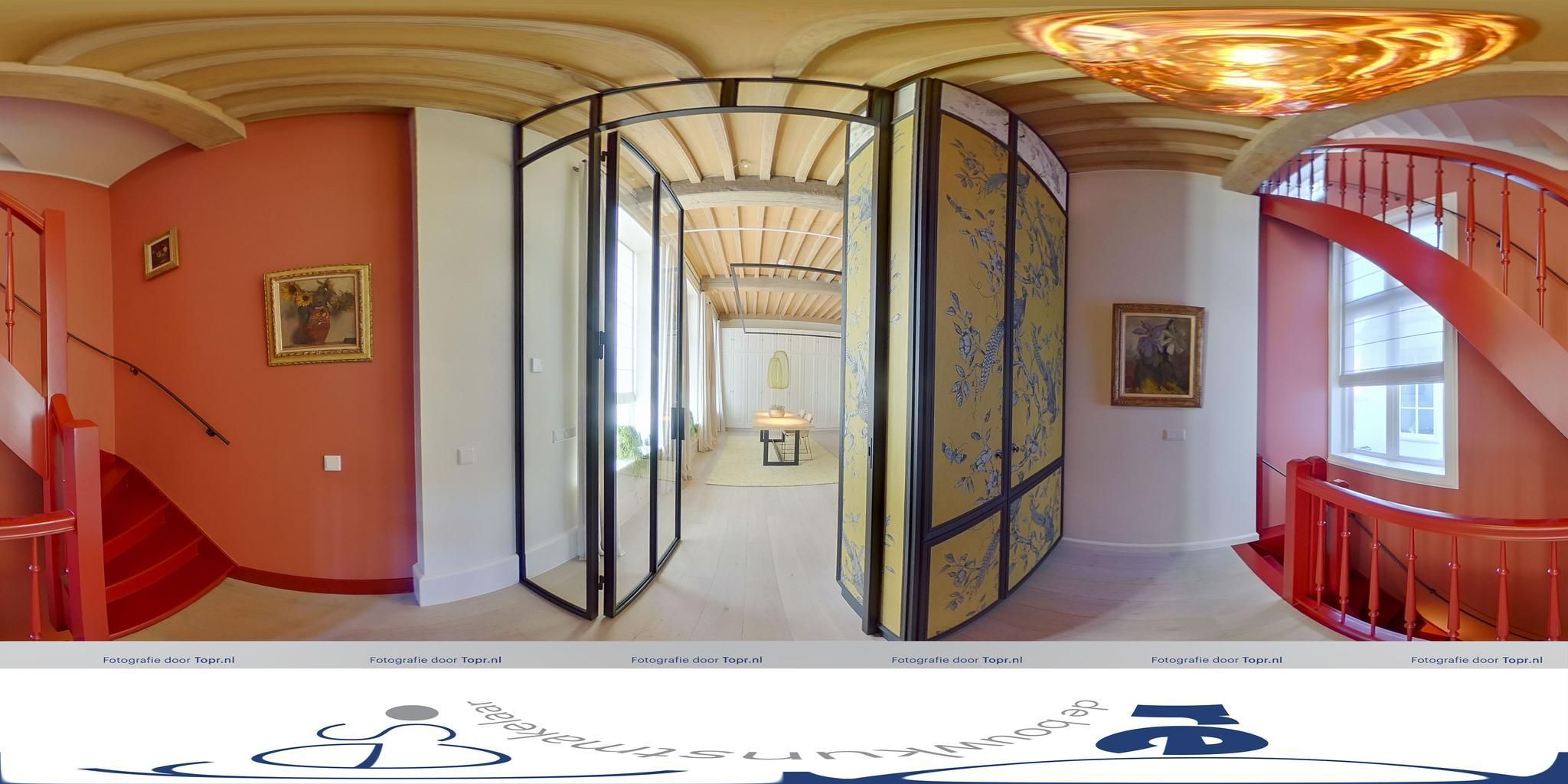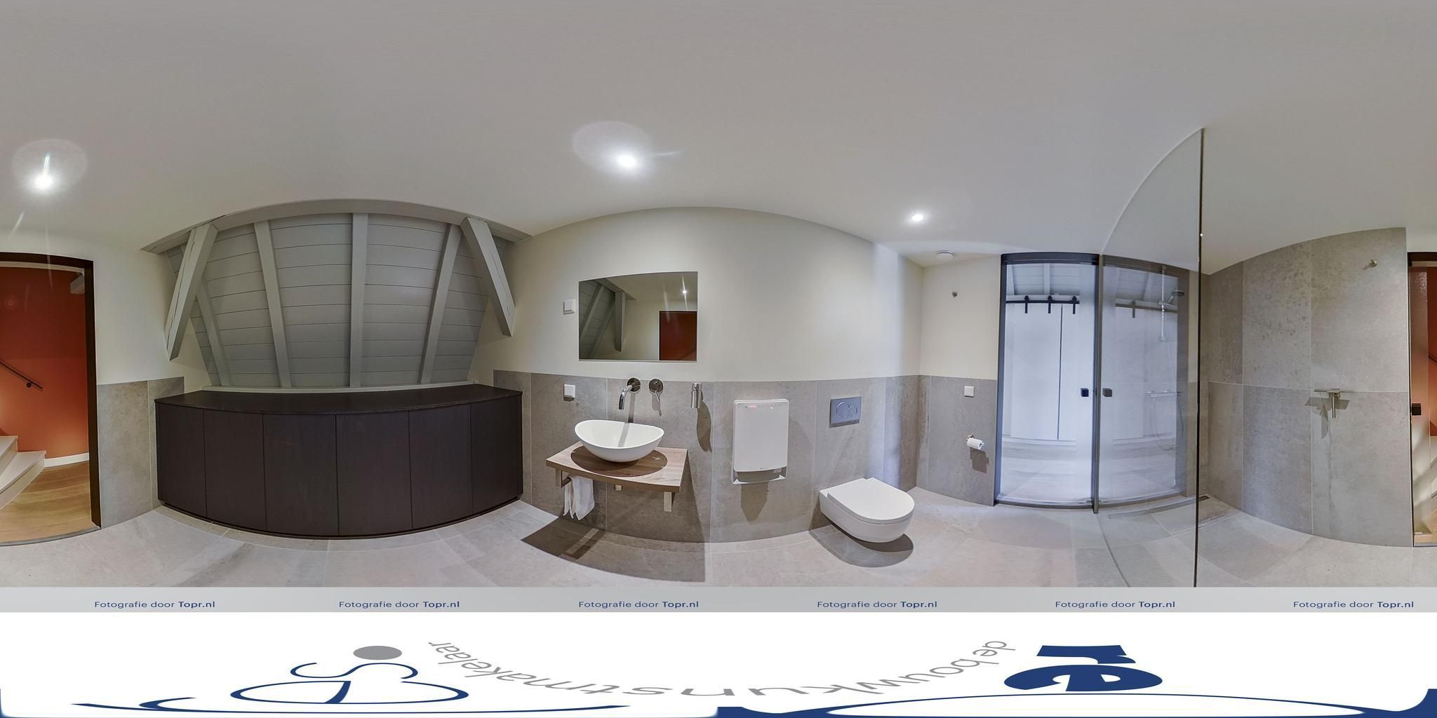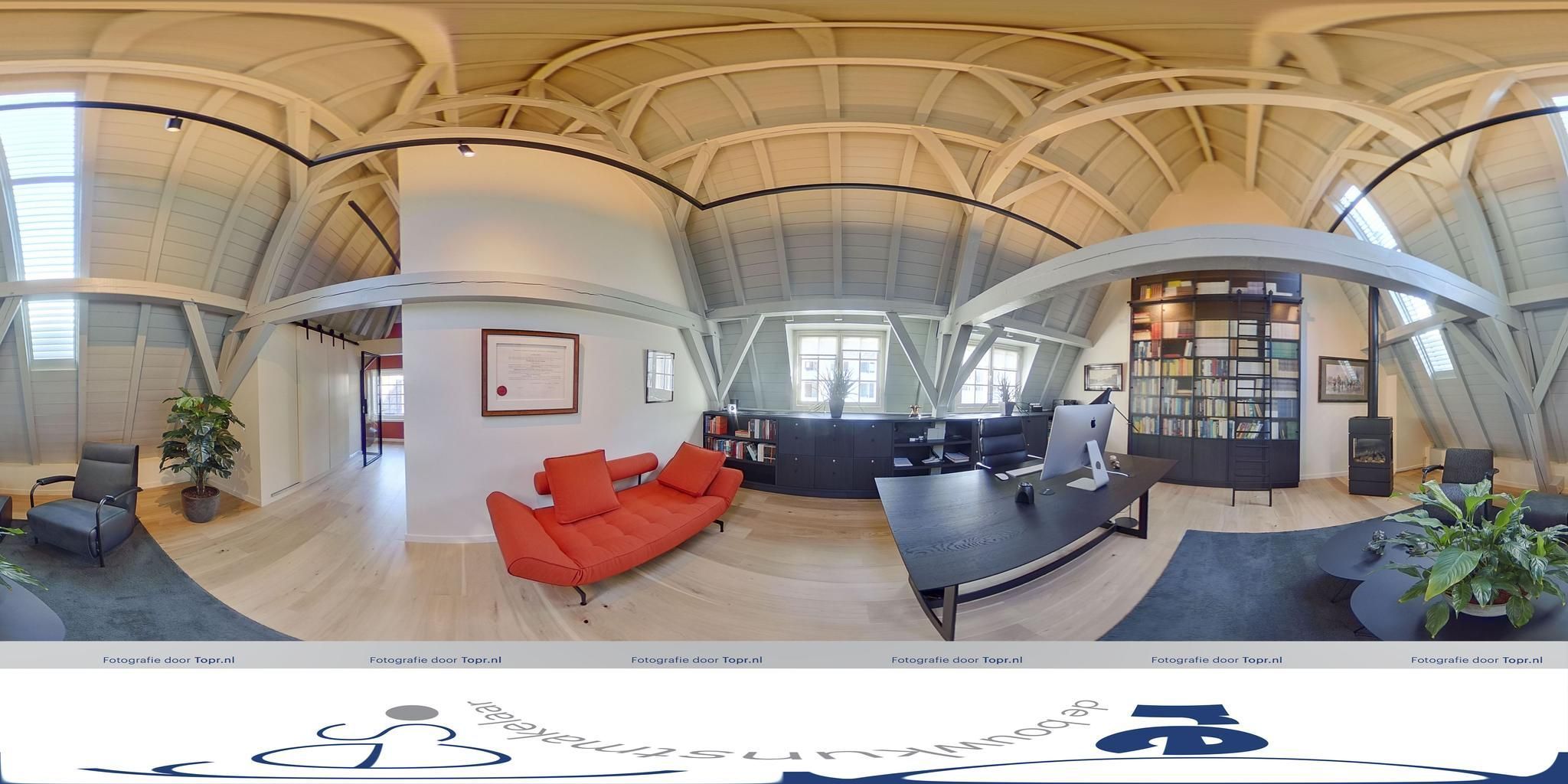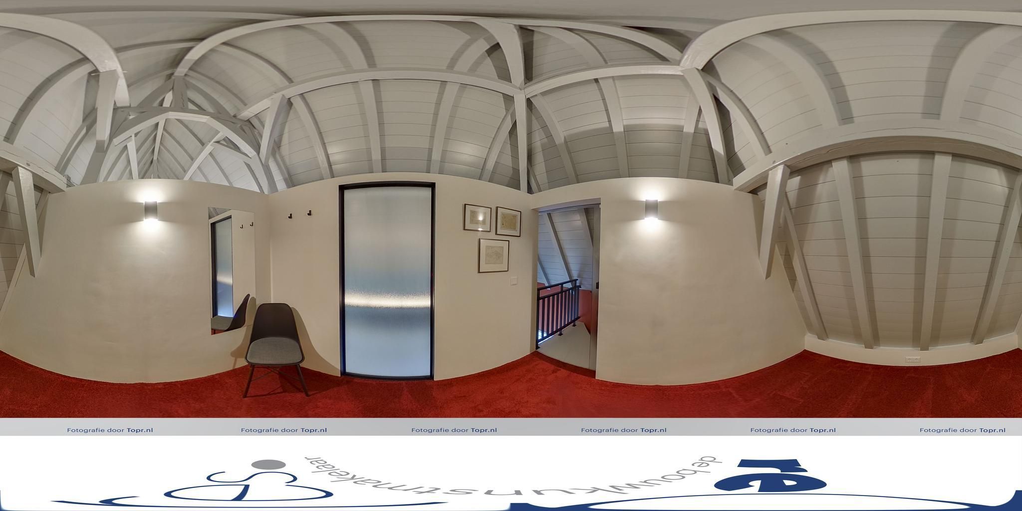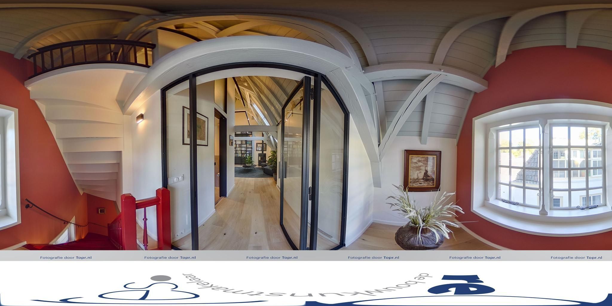 De tweede verdieping is thans een werkkamer. De stalen kozijnen en industriële gaskachel geven de ruimte een moderne uitstraling, in fraai contrast met de historische kap dat juist bestaat uit klassiek houtwerk met schitterende houten spanten. Deze combinatie maakt het kantoor eigentijds. Uiteraard is deze ruimte ook als slaapkamer/ gastenkamer in te richten. Met een kleine ingreep is het mogelijk om hier een tweetal extra slaapkamers te realiseren elk met eigen dakkapel of dakraam. De tweede badkamer op deze verdieping heeft een riante douche, een zwevende WC, een badkamermeubel en een wastafel alsmede de schuifdeur met toegang tot de trapopgang naar de derde verdieping