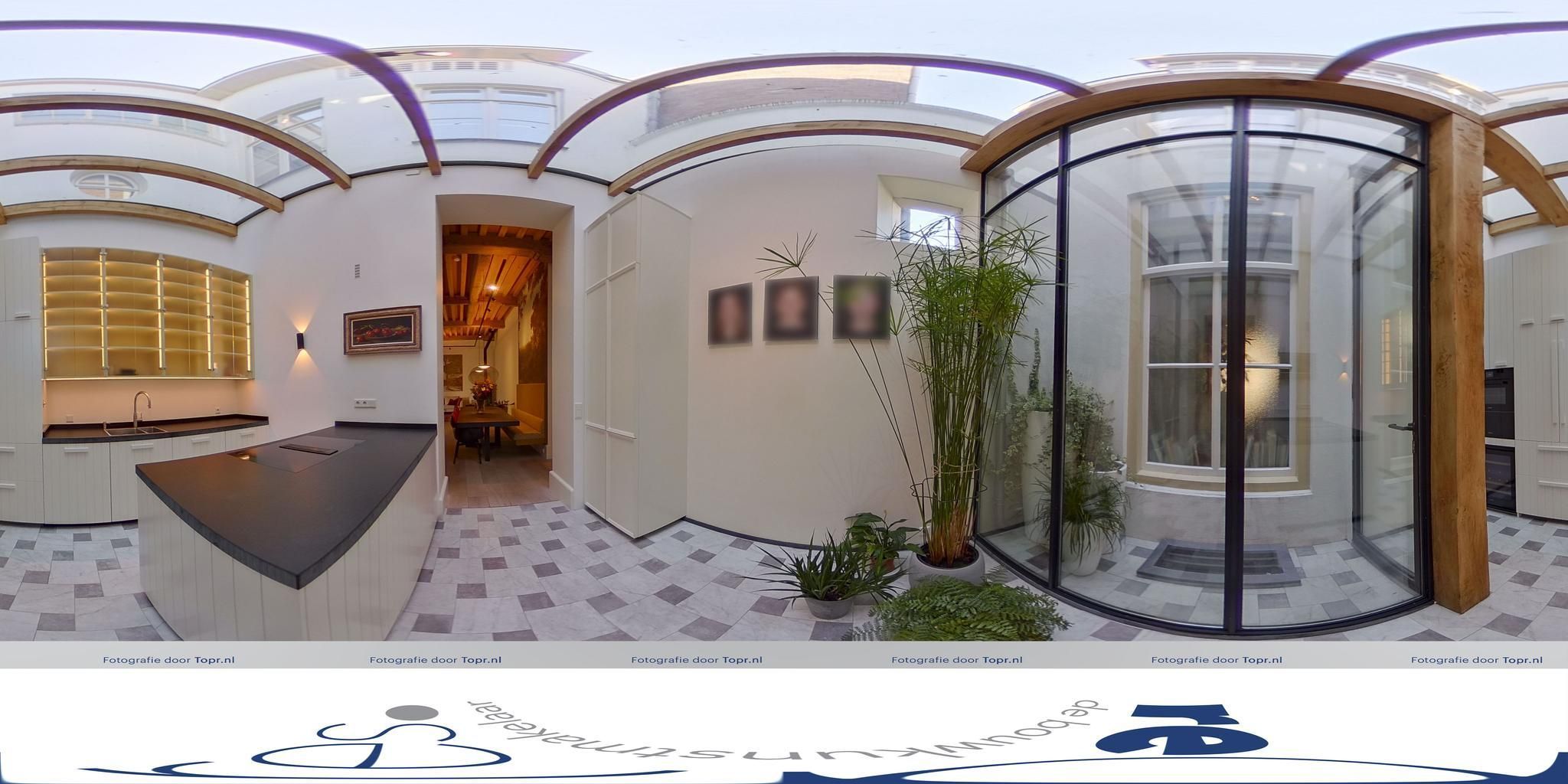 Mede dankzij het volledig glazen dak en de wand met stalen kozijnen, is de keuken een heerlijk lichte ruimte. Ook zijn het tegelwerk en de keukenfrontjes lichtgekleurd waardoor de keuken een frisse en ruimtelijke uitstraling heeft. Met een schiereiland, veel kast- en werkruimte en hoogwaardige Miele-apparatuur is dit een keuken om van te dromen!