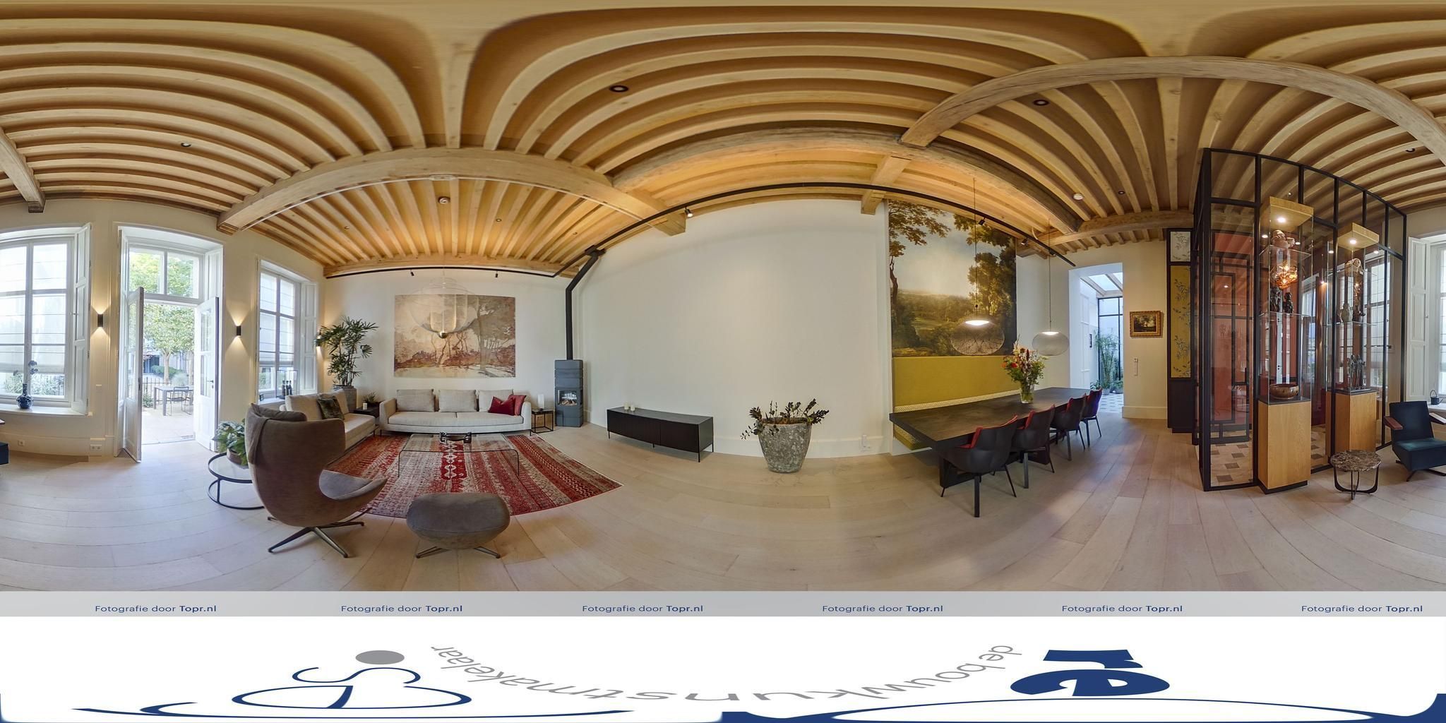 De woonkamer is zeer ruim, voorzien van prachtige raampartijen en een hoog plafond met karakteristieke monumentale houten moerbalken met prachtige kinderbinten. De industriële gaskachel, beschikbaar voor sfeerverwarming, geeft de woonkamer een moderne touch. Naast een ruim opgezette zithoek is er richting de keuken ook meer dan voldoende ruimte voor een riante eettafel.