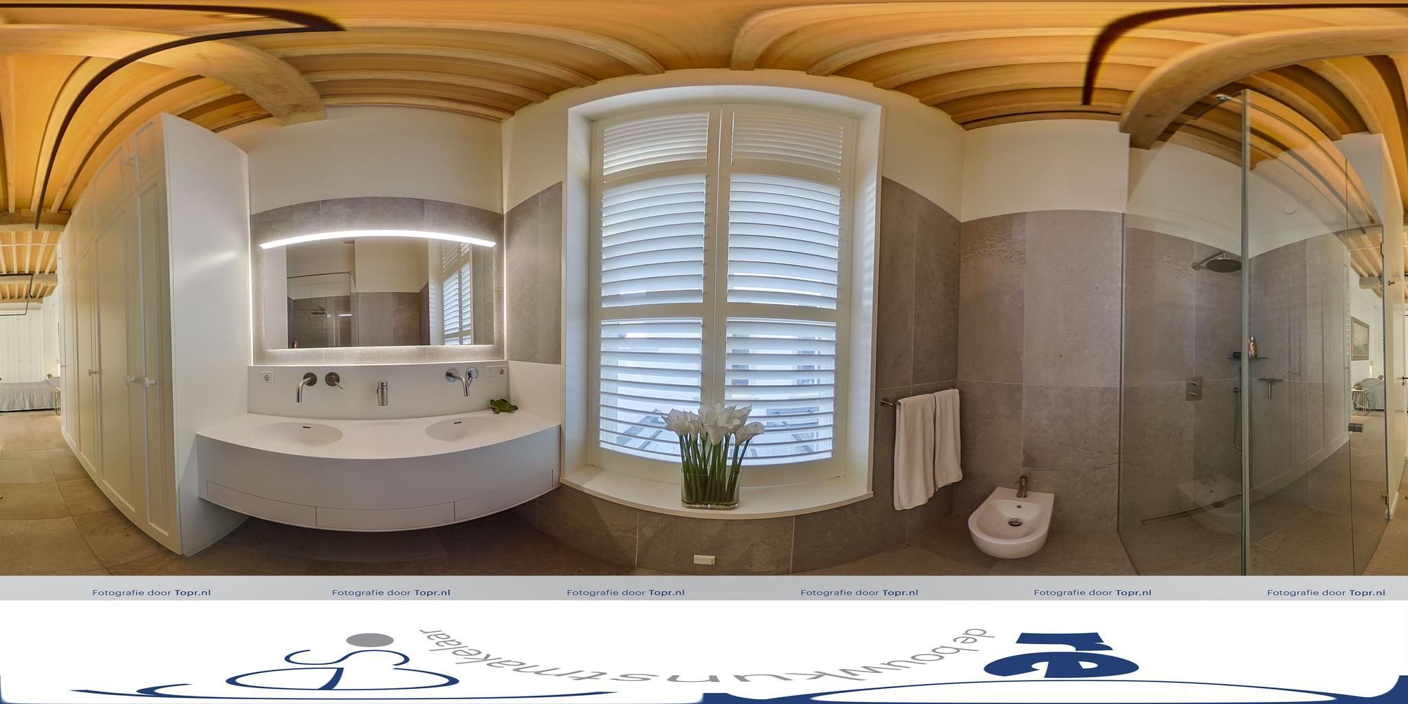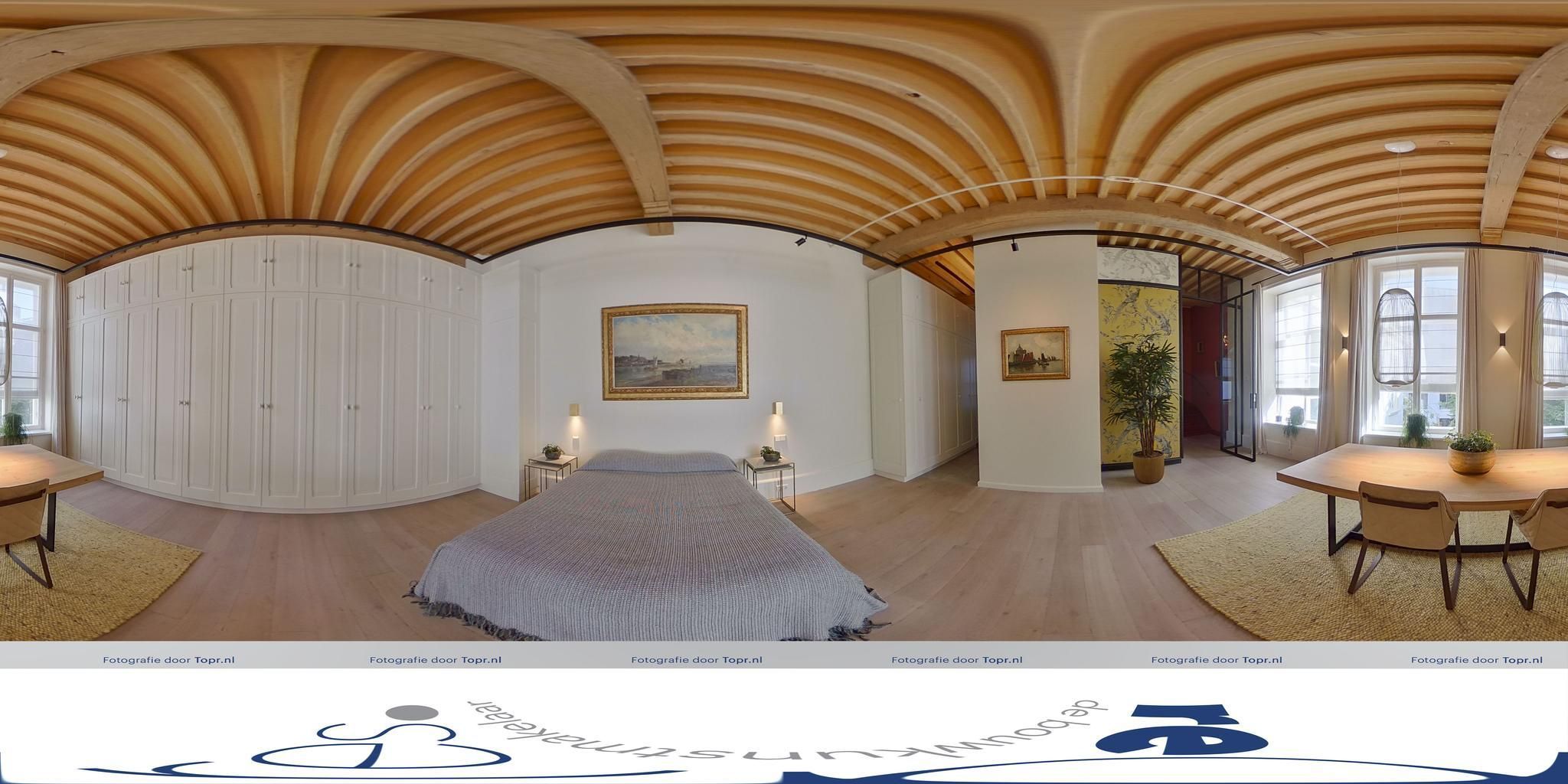 Via het koraalkleurige trappenhuis de eerste verdieping. Dit is een grote slaapkamer met een eigen badkamer. Het vertrek heeft een hoog plafond met monumentale houten balken met grote vensters voor een fraai uitzicht. De talrijke kasten zijn allemaal maatwerk, dus plenty ruimte voor uw gehele garderobe. De slaapkamer is voorzien van een en suite badkamer met comfortabele regendouche, een badkamermeubel met dubbele wastafel, een bidet en een separate WC. De badkamer is voorzien van inbouwkasten met daarin de aansluitingen voor de wasmachine en droger en een stortbak met kraan. Overigens is het met een eenvoudige ingreep mogelijk om van deze slaapkamer 2 slaapkamers te maken, mocht dat nodig zijn.