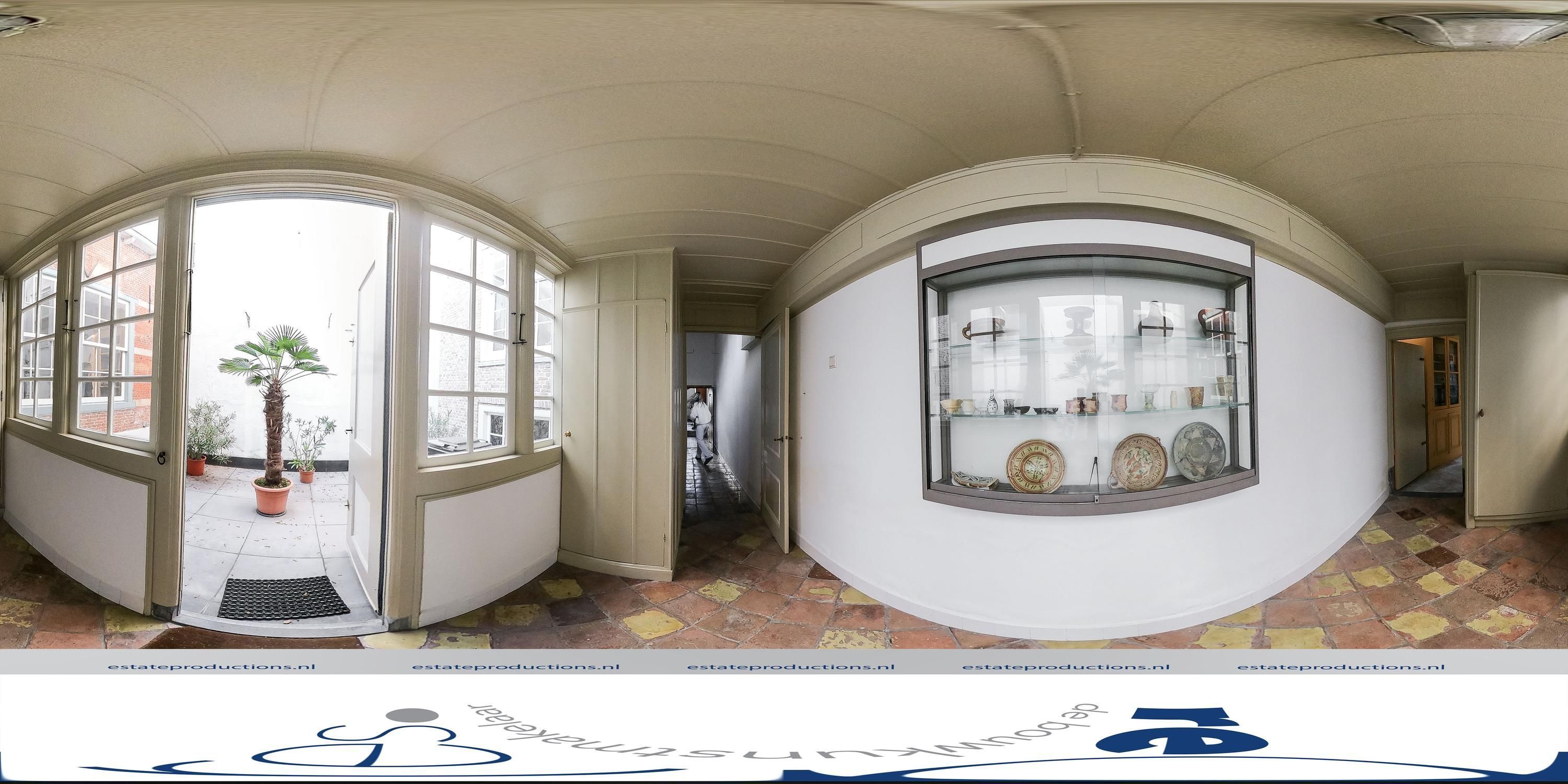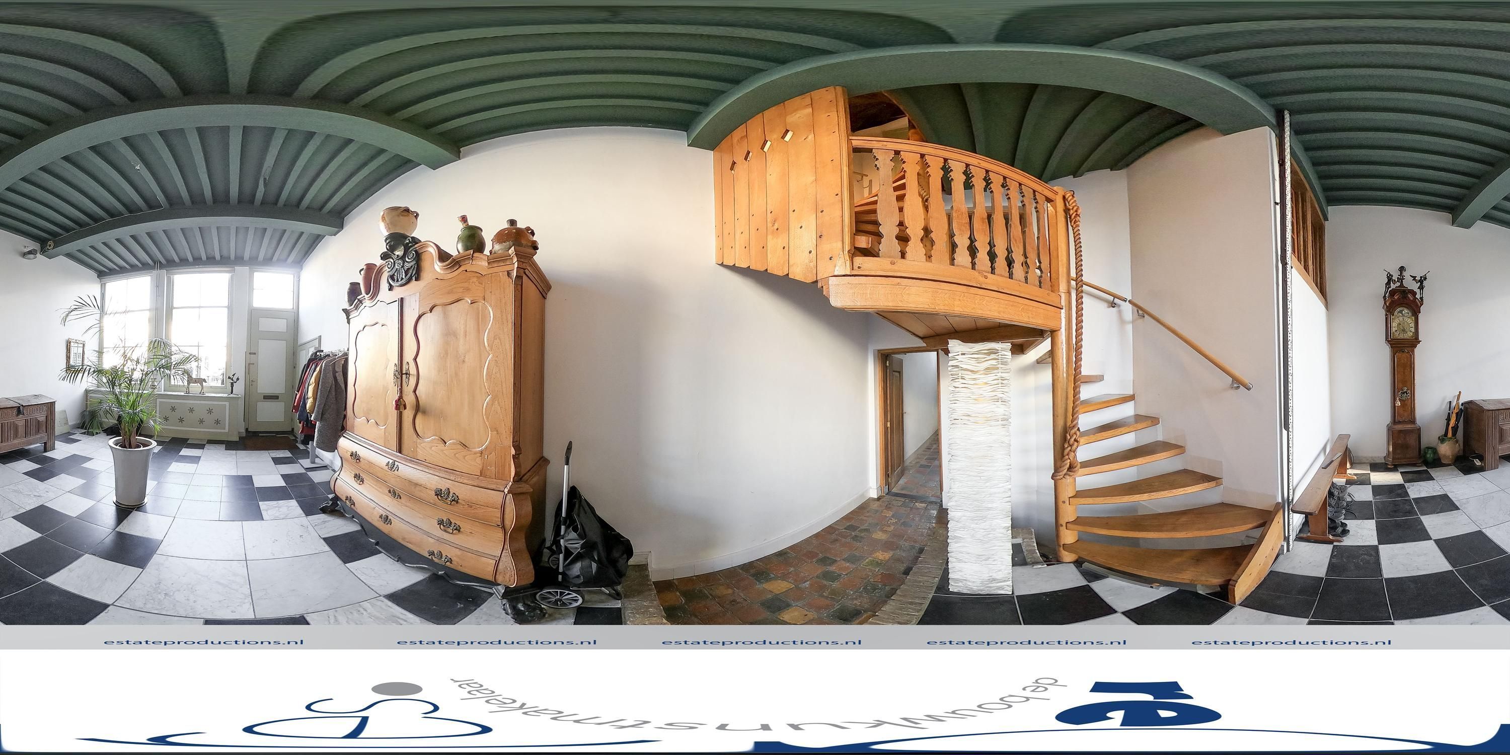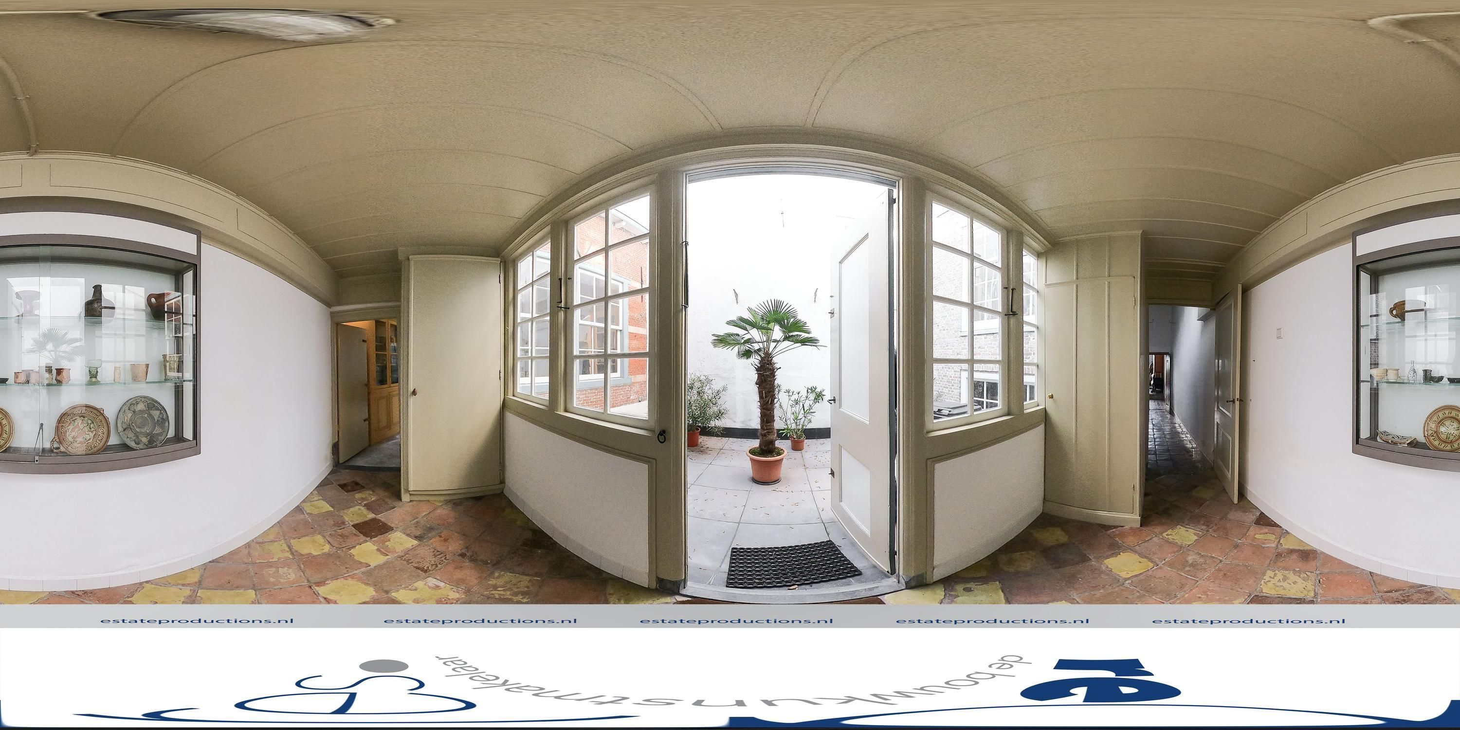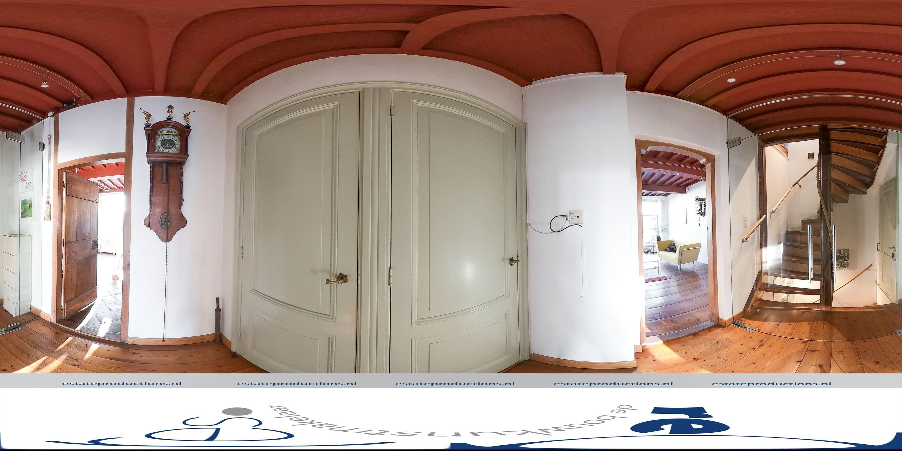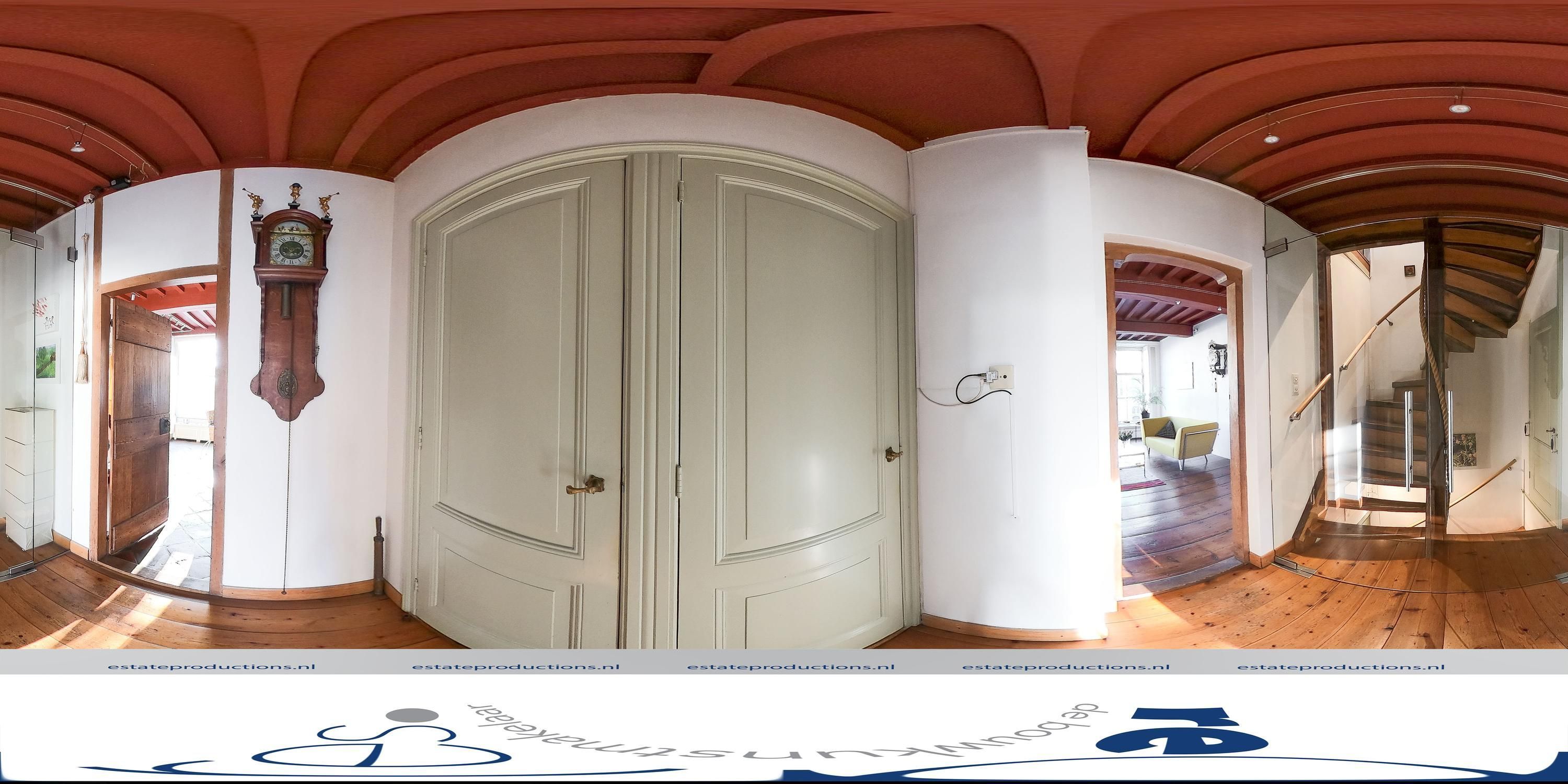 Bij binnenkomst op de begane grond wordt de historie meteen voelbaar. Allereerst is er een grote hal van circa 35m² met een insteekverdieping, waarbij de oorspronkelijke ramen, die uitkeken op de voormalige winkel- of ambachtsruimte, nog zichtbaar zijn. Deze ruimte, met een plafondhoogte van vier meter, is ideaal als werkplek, tv-kamer of atelier. De eiken spiltrap is prachtig en functioneert al honderden jaren. Halverwege de spiltrap is een bordes welke toegang geeft tot de insteekverdieping en de bovengelegen verdiepingen. Onder dit bordes bevindt zich een stenen spiltrap naar de twee meter hoge karakteristieke gewelfkelder onder de gehele hal. Oorspronkelijk had de kelder een eigen entree vanaf de straat. De begane grond van het voorhuis, de insteekverdieping en de eerste verdieping zijn gedekt door houten moerbalken met ertussen kinderbalkjes, wat zorgt voor een verfijnd beeld.