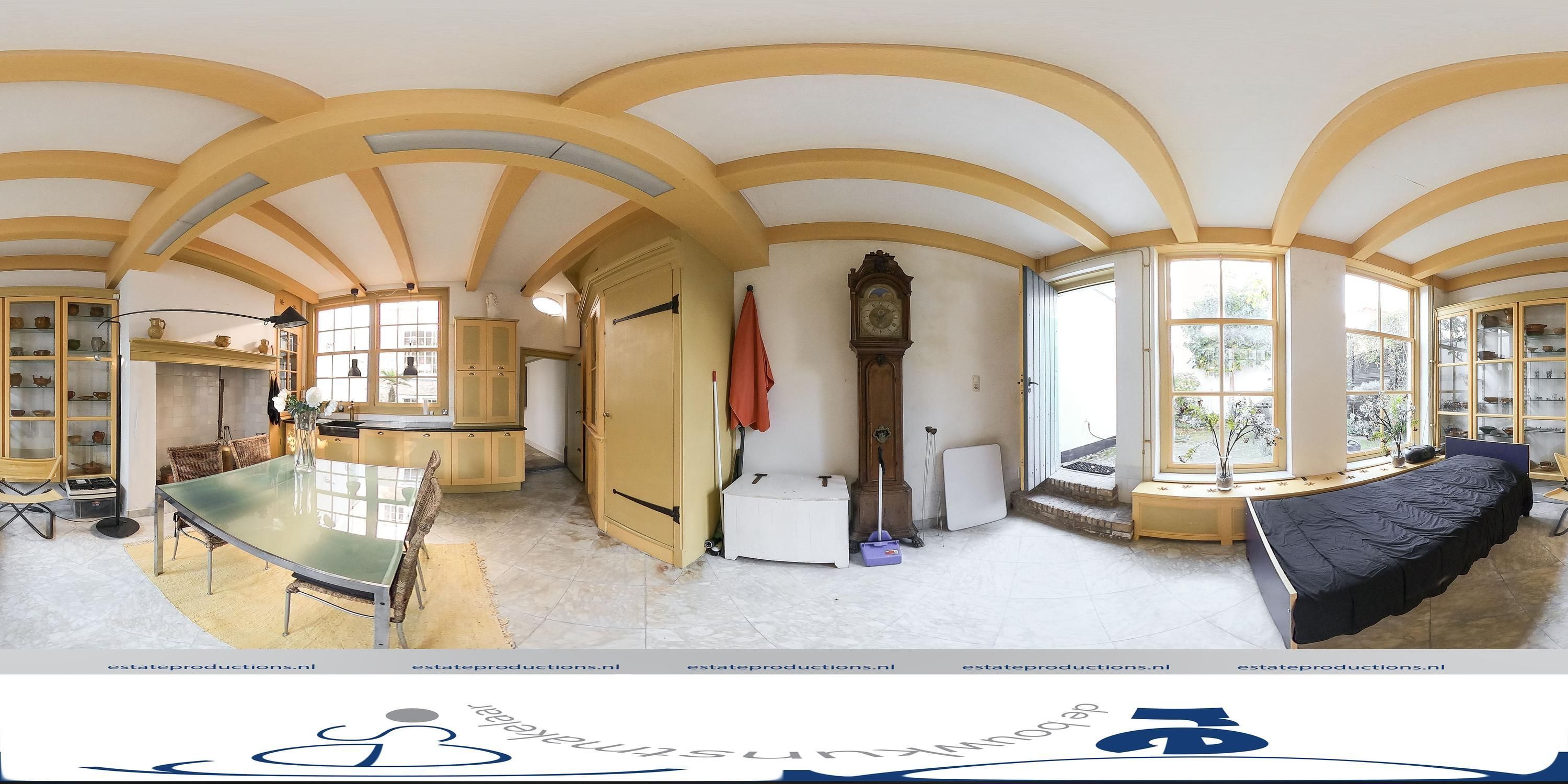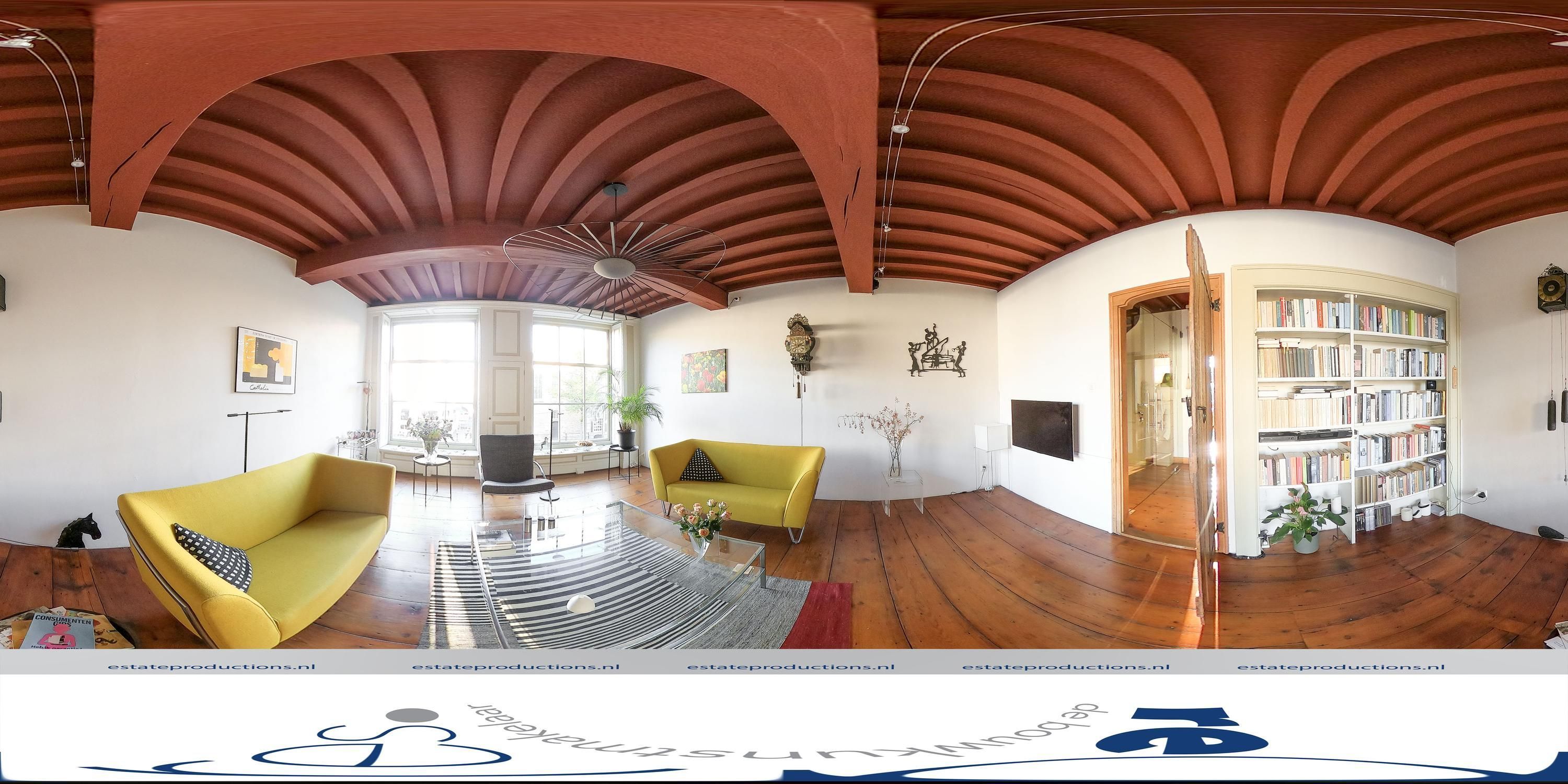 De gehele eerste verdieping is voorzien van het karakteristieke ossenbloedrode balkenplafond, wat de ruimtes een warme en authentieke uitstraling geeft. Aan de achterzijde bevindt zich een ruime woonkeuken van circa 23 m², waar dit diepe rood meteen in het oog springt en een uniek historisch accent toevoegt. Grote ramen in de woonkeuken zorgen voor een aangename lichtinval en bieden uitzicht op de binnenplaats en het charmante achterhuis. Het is een ideale plek om rustig te ontbijten of koffie te drinken om de dag te beginnen.