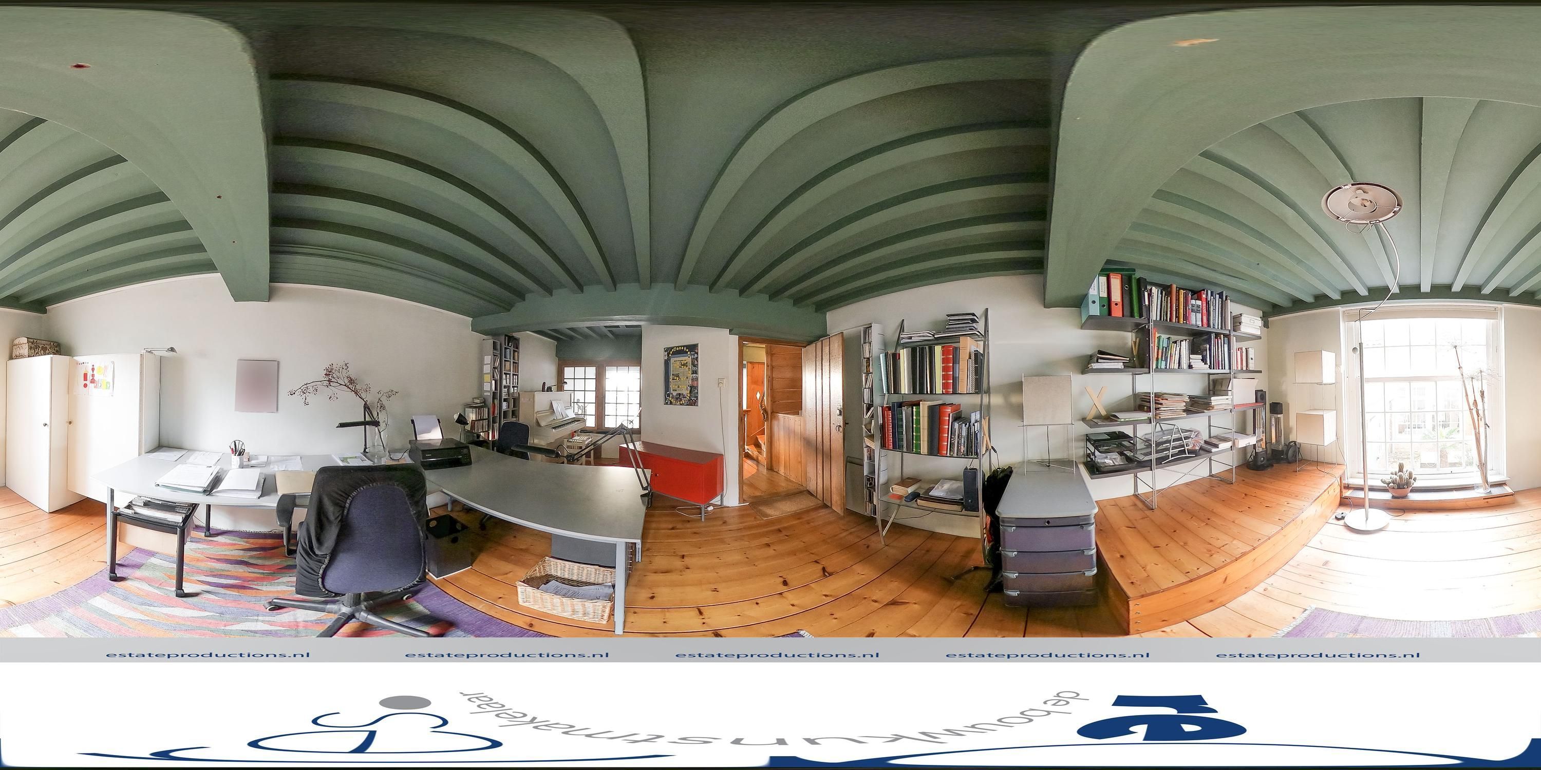 Via de trappartij bereik je halverwege de insteekverdieping. Deze ruimte (circa 19 m²) is ideaal als kantoor, maar kan ook dienstdoen als slaapkamer.