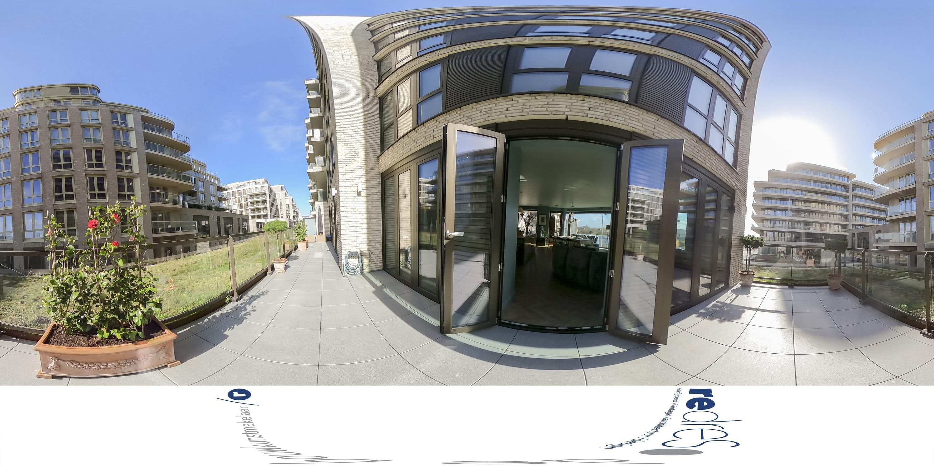 De twee terrassen liggen aan de zuidwestzijde en bieden elk een eigen gebruiksmoment. Zij sluiten direct aan op de riante living. De ligging maakt dat hier vanaf de late ochtend tot in de avond zon aanwezig is, met zicht op de beweging van het Deltaplein en de lucht boven de duinen.