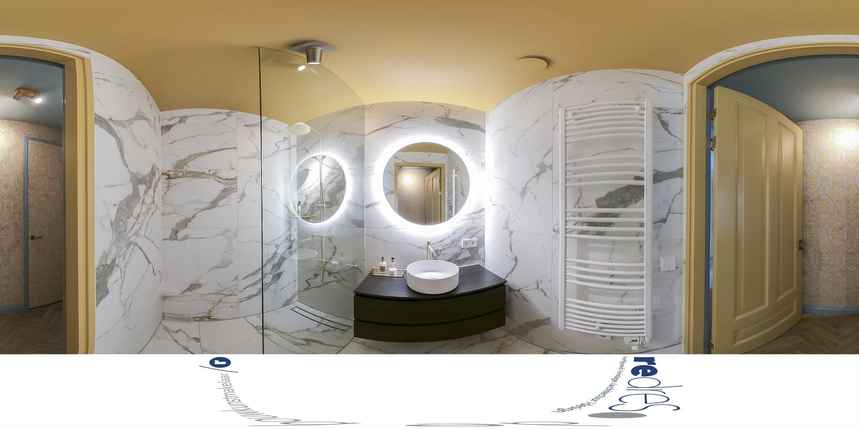 De mastersuite is ontstaan door samenvoeging van twee slaapkamers en beschikt over zeven maatwerk kasten en een directe verbinding met een ruime badkamer. De badkamer geeft het spa-gevoel van een boutique hotel. De ruimte is afgewerkt met een handgemaakte Sahara Ocra mozaïekwand uit Murano, terwijl het sanitair is uitgevoerd in messing van Gessi.