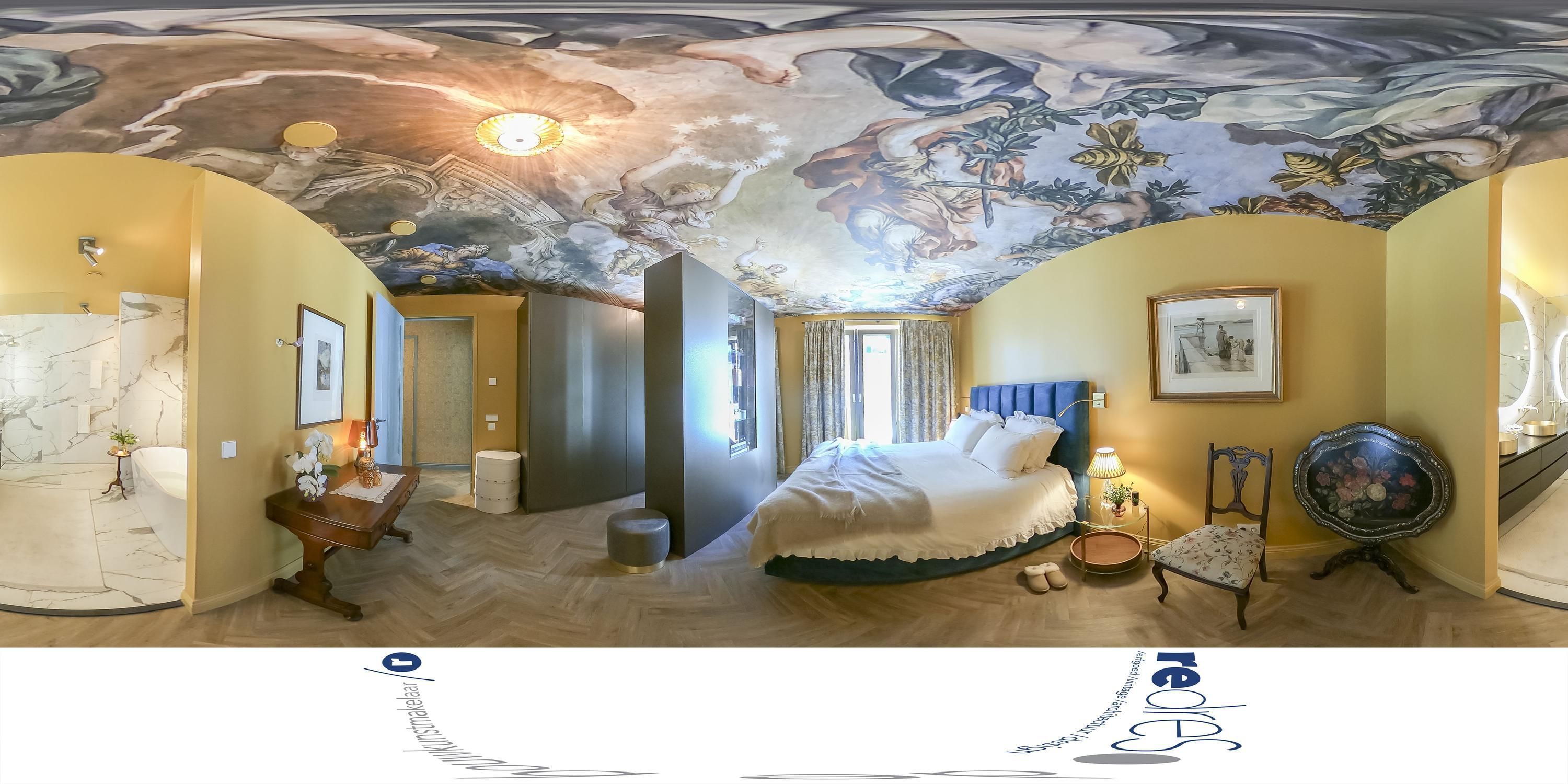 In de Mastersuite waan je je in een Italiaans Palazzo. Het plafond is geïnspireerd op historische schilderkunst, ontleend aan het Palazzo Barberini in Rome. Dit geeft de ruimte een bijna theatrale kwaliteit, waarbij de kamer zich niet alleen als slaapruimte gedraagt, maar als een vertrek met een eigen sfeer en identiteit, waarin rust en verfijning samenkomen.