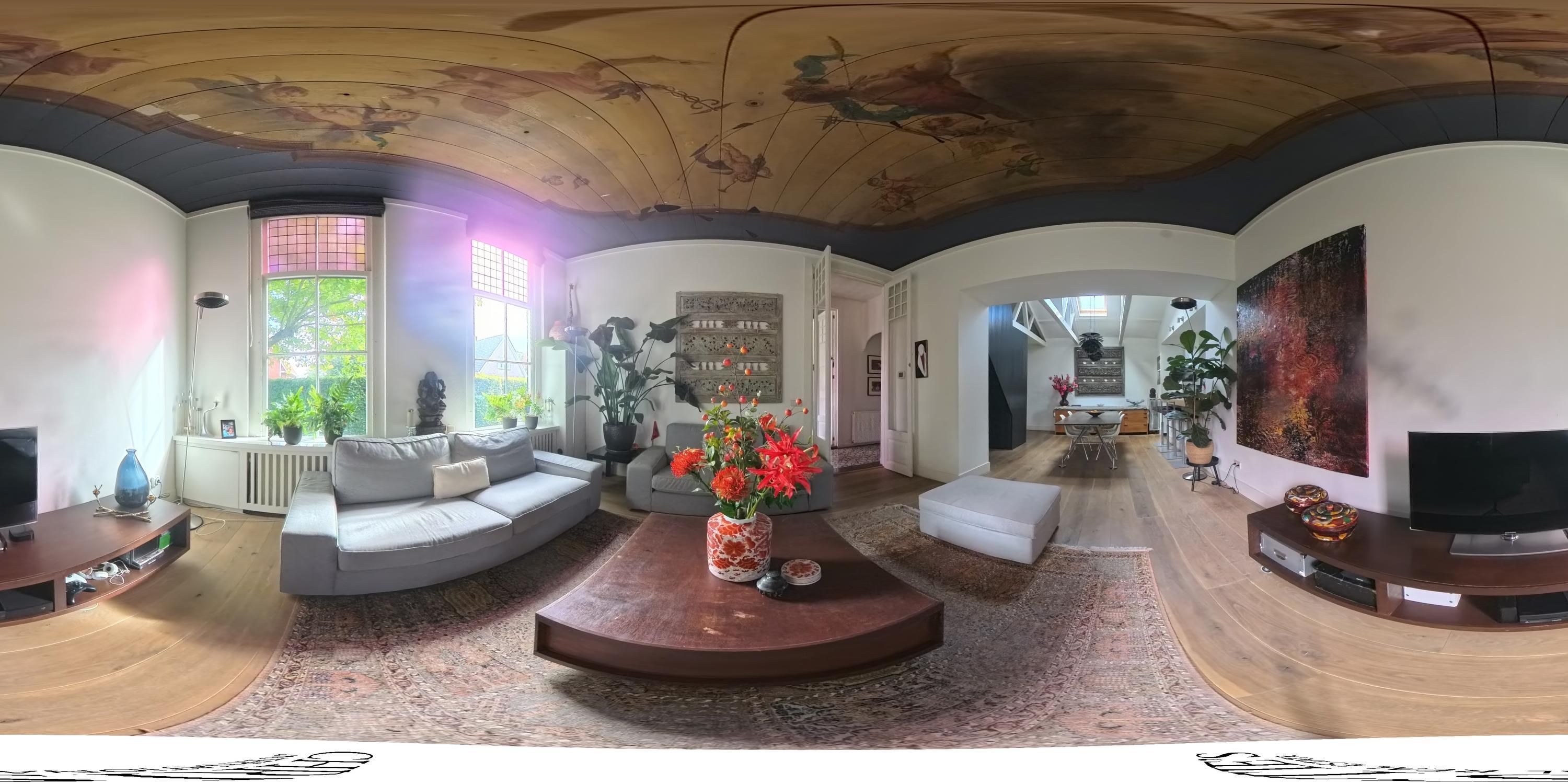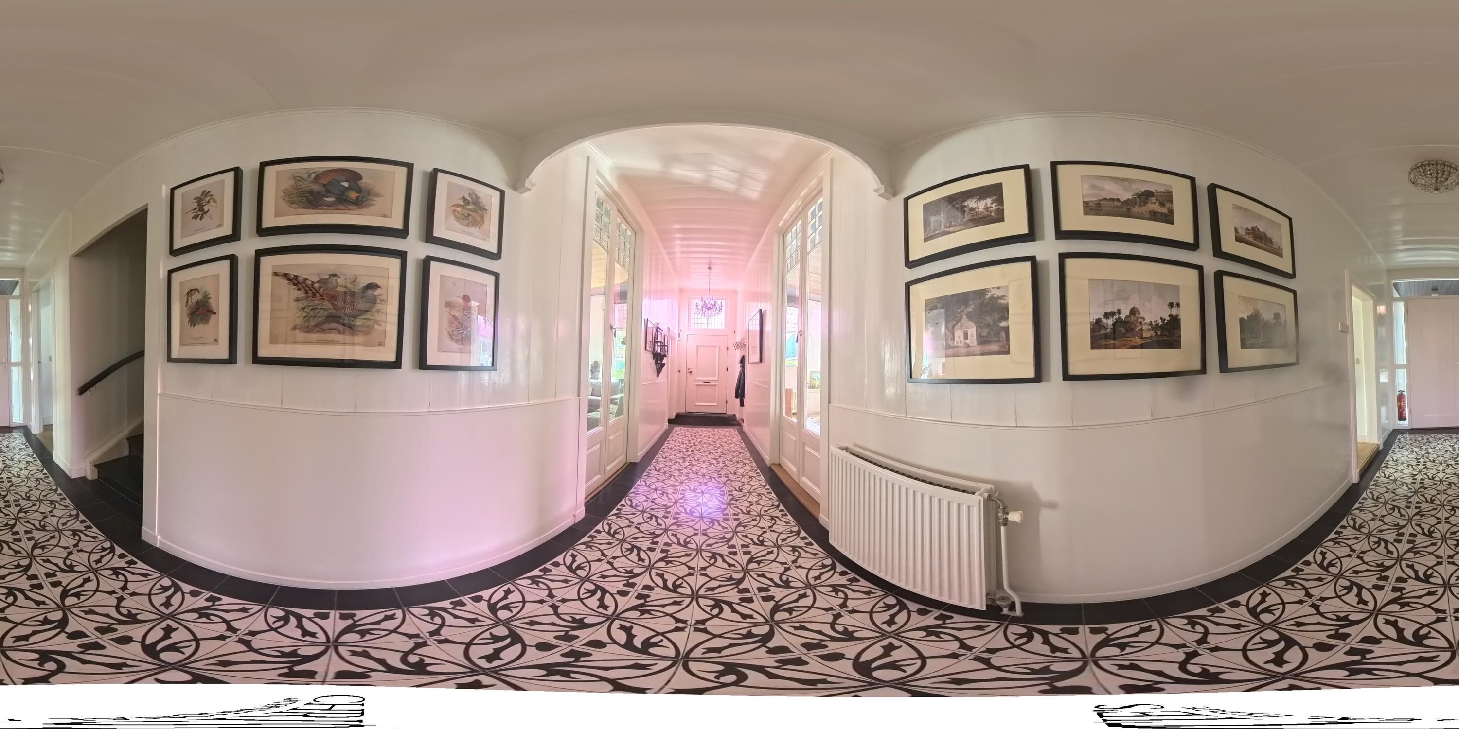 Een hoge haag langs de Kerkbuurt vormt de overgang tussen straat en huis. Via het klinkerpad wordt de monumentale entree bereikt. De lange brede gang van circa tien meter verbindt de kamers met elkaar via dubbele deuren, waardoor zichtlijnen ontstaan die de diepte van het huis benadrukken. Rechts ligt de woonkamer met het beschilderde plafond. Door de diepe kozijnen valt het licht gefilterd binnen, waardoor de florale en nautische motieven subtiel zichtbaar blijven. De houten vloer draagt bij aan de rustige sfeer van de ruimte. De ramen zijn voorzien van Ruysdael-restauratieglas, dat de uitstraling van mondgeblazen glas behoudt maar zorgt voor een comfortabel binnenklimaat.