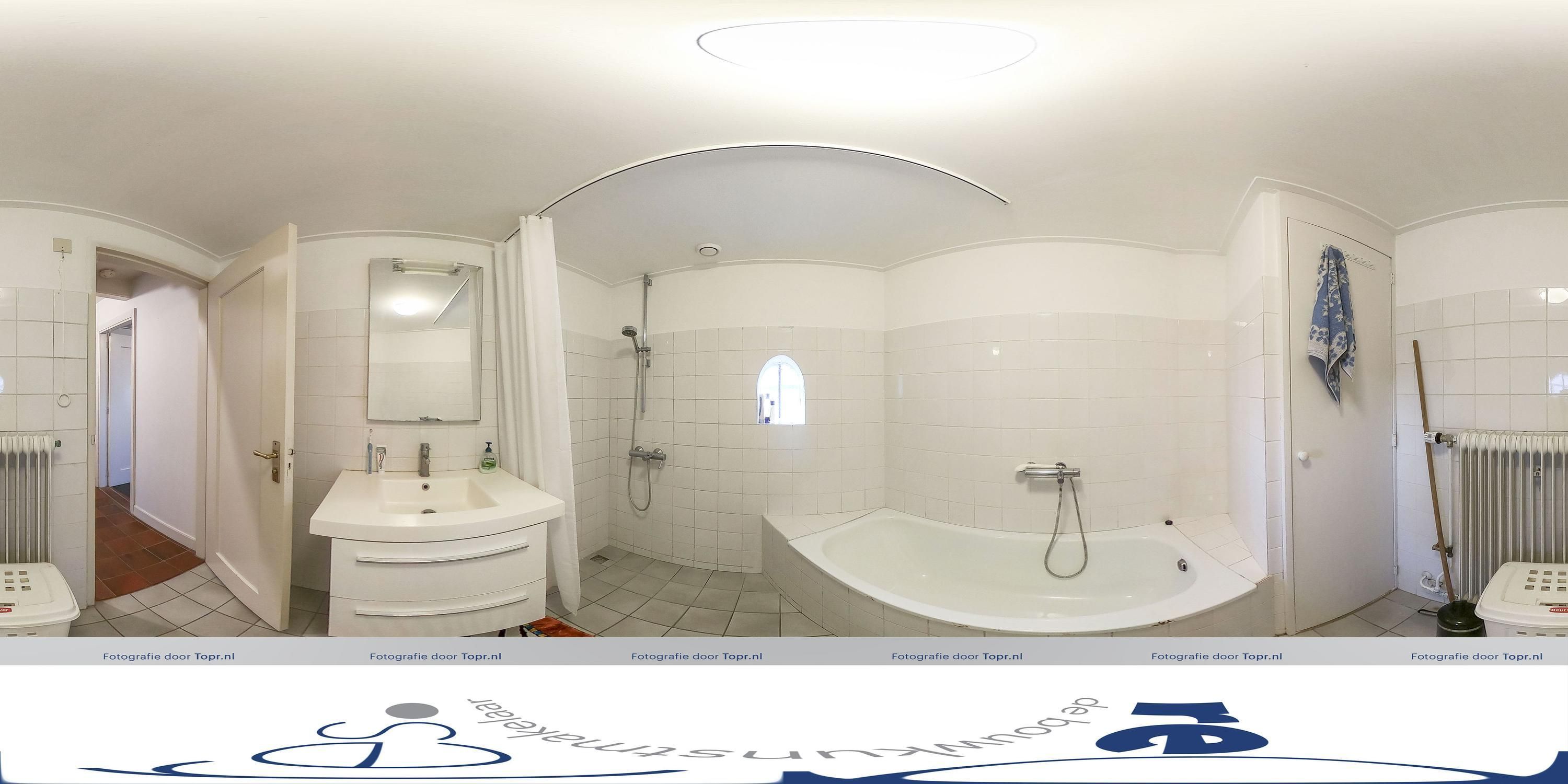 Aansluitend de gang met daarin de aansluitingen voor de wasmachine en -droger, de badkamer met ligbad, douche, wastafel en WC. Ook is hier een doorgang naar de schuur aan de achterzijde en de trapopgang naar de verdieping. Achter het huis bevindt zich het oorspronkelijke koetshuis met een 'trochreed' (doorgang) waarbij de paarden van de postkoets ververst konden worden en de koetsier een versnapering kon gebruiken in het café. De koetsen reden er aan de ene kant naar binnen en aan de andere kant naar buiten. Dit is een fantastische plek om de mooiste loft van Friesland te creëren.