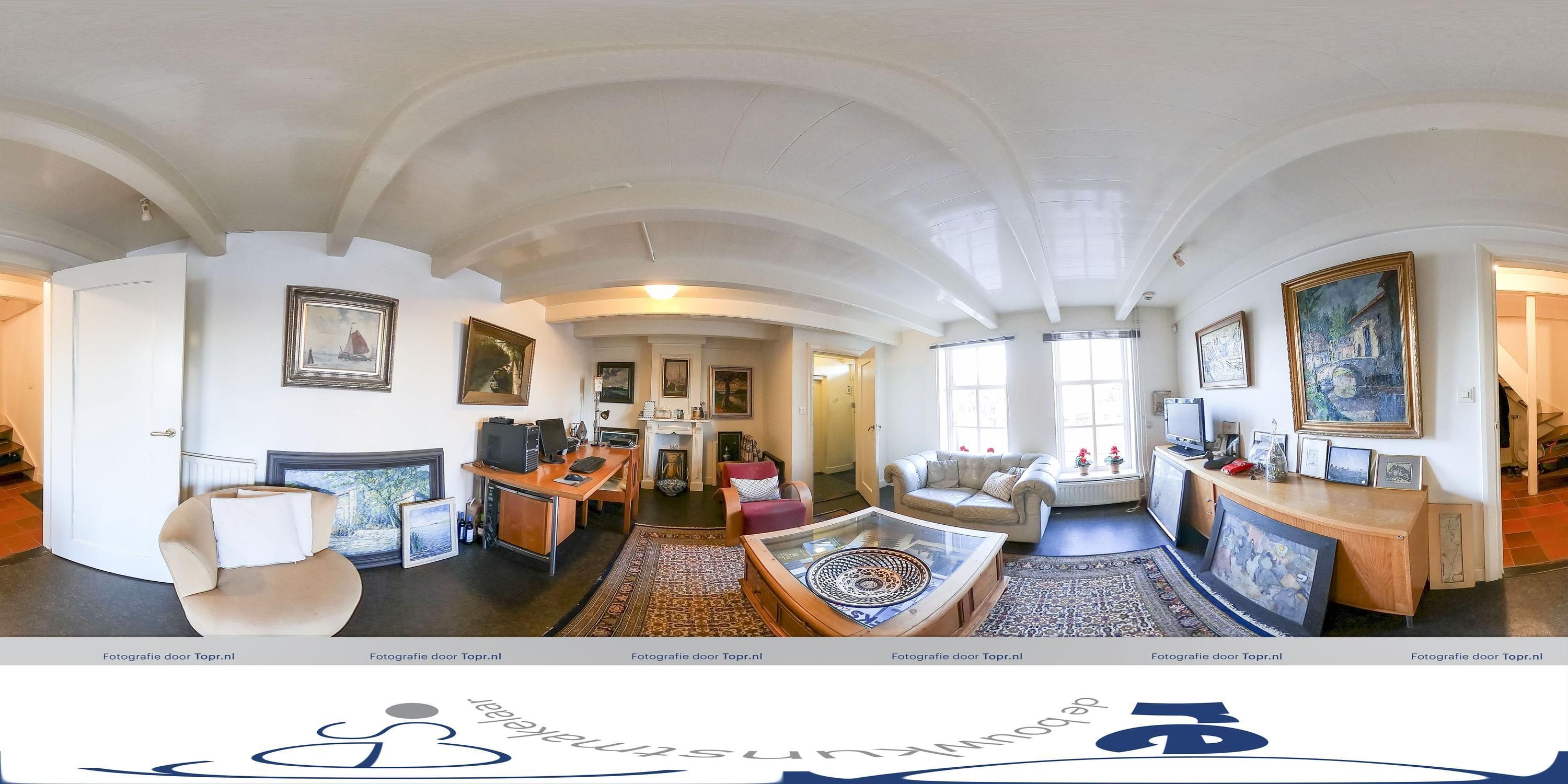 Terug naar de ingang, aan de linkerzijde van de hal de woonkamer, wederom met een fraaie schouw met kachel en de grote raampartijen aan de voorzijde. Overal springen ook de fraaie balkenplafonds in het oog.