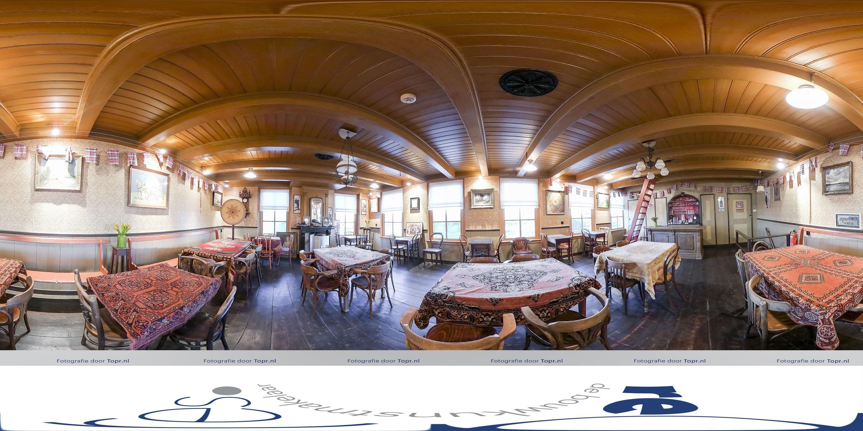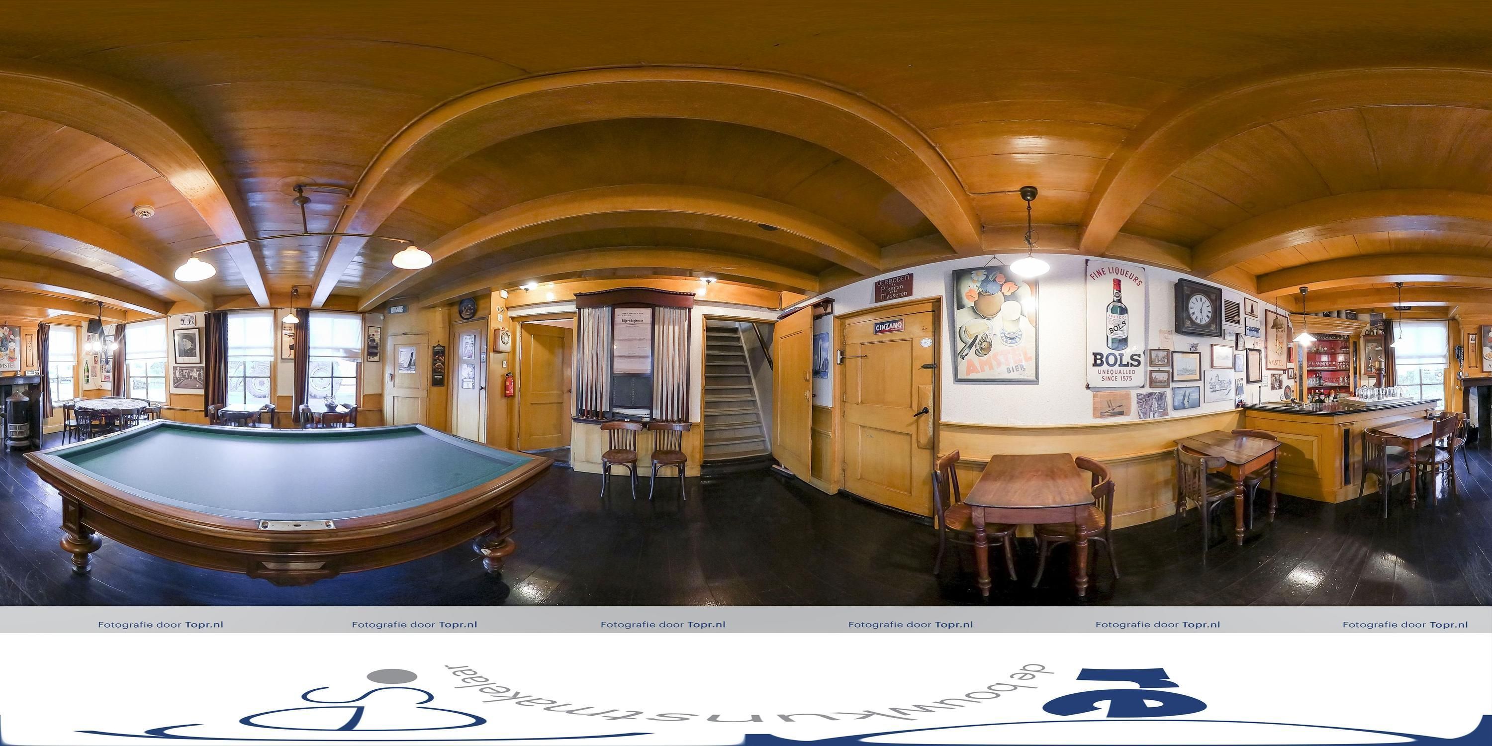 Aansluitend beneden het café en boven de feestzaal. Het is een klassiek bruin café, met kleedjes op de tafels, oude reclames en foto’s aan de floraal behangen wanden, een klassieke toog met een dito biertap, en een oude schouw, voor kroegpraat in de rokersstoelen voor de haard. Hier klonk dan een gemoedelijk gerabarber, doorspekt met gelach en tegen elkaar tikkende biljartballen. Aan de achterzijde de trap naar de feestzaal.