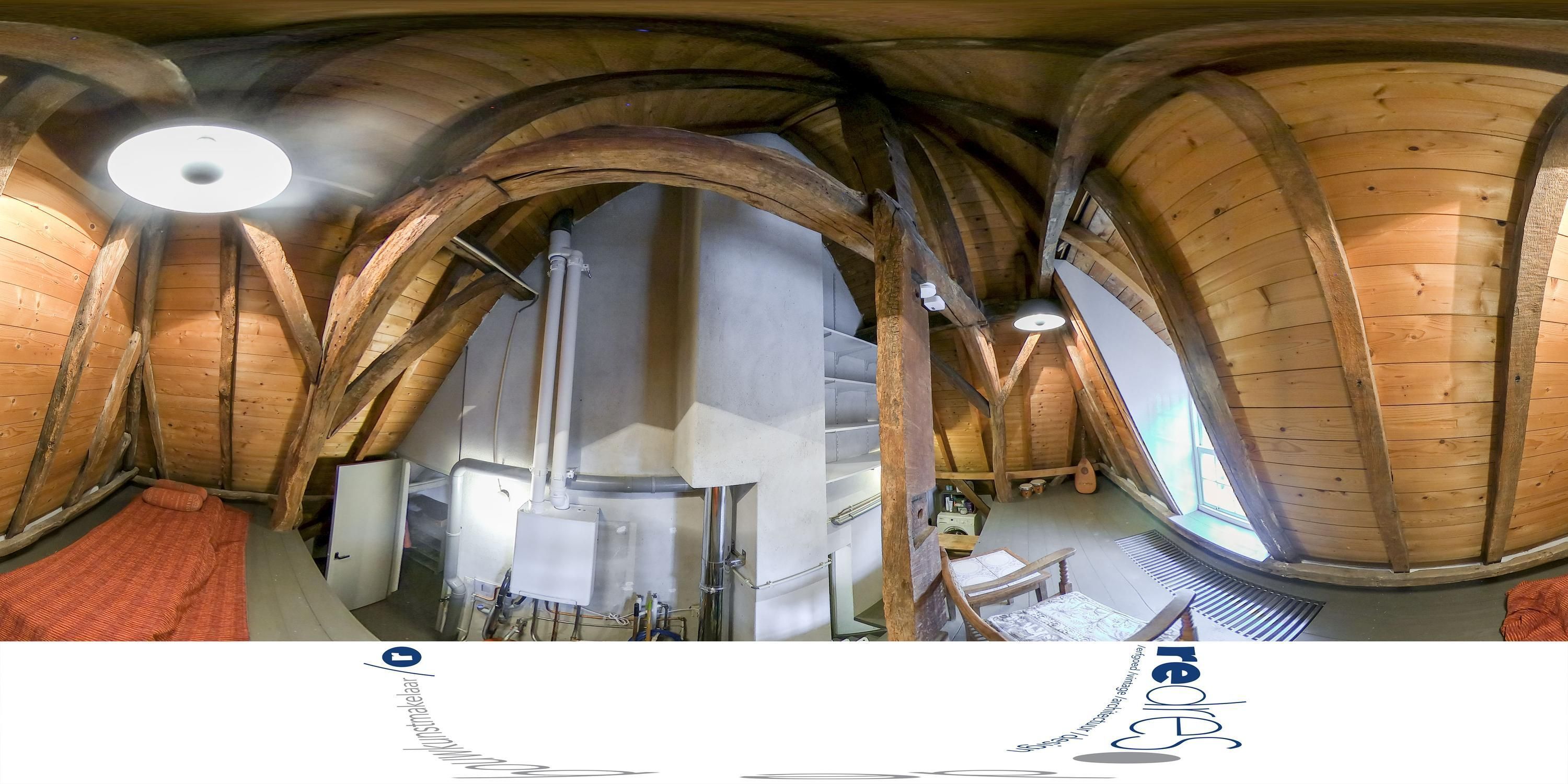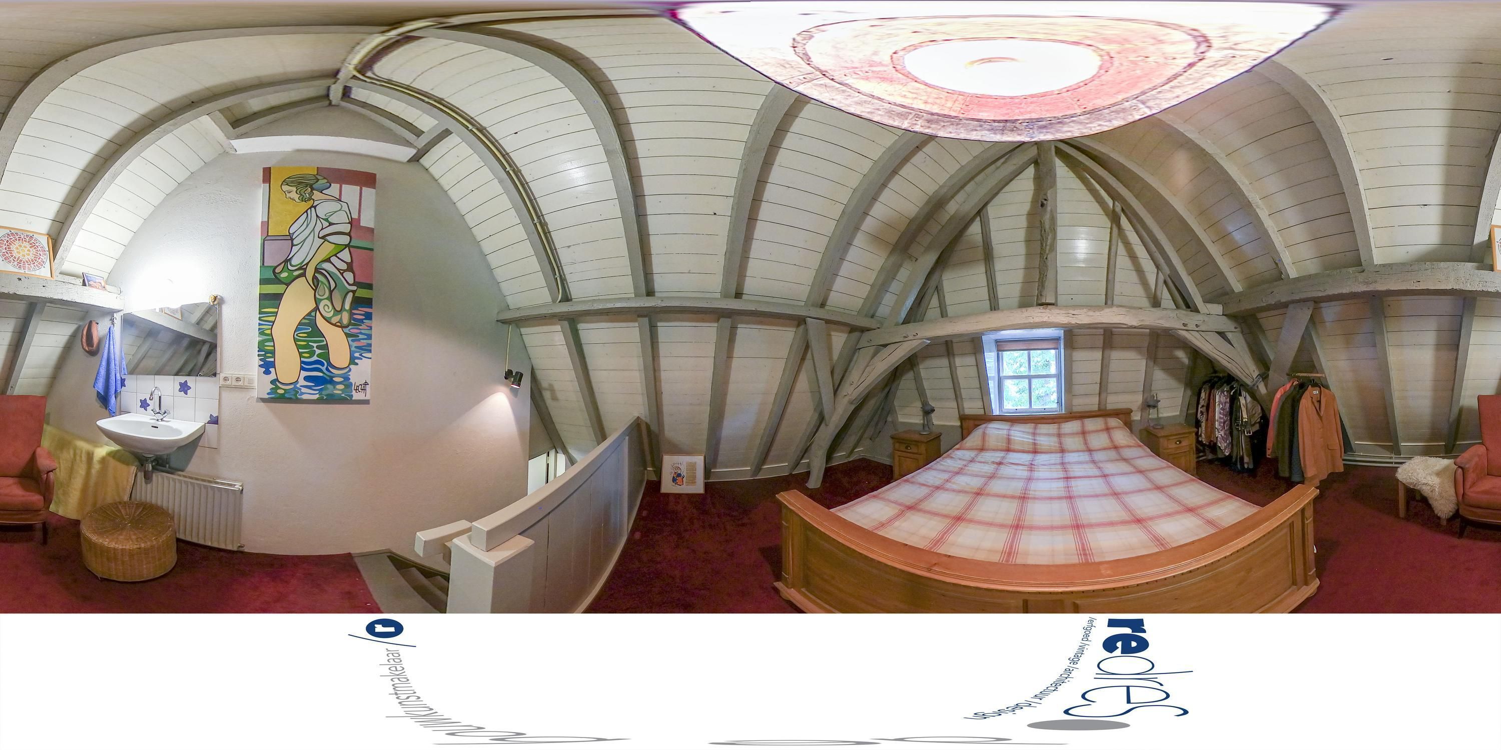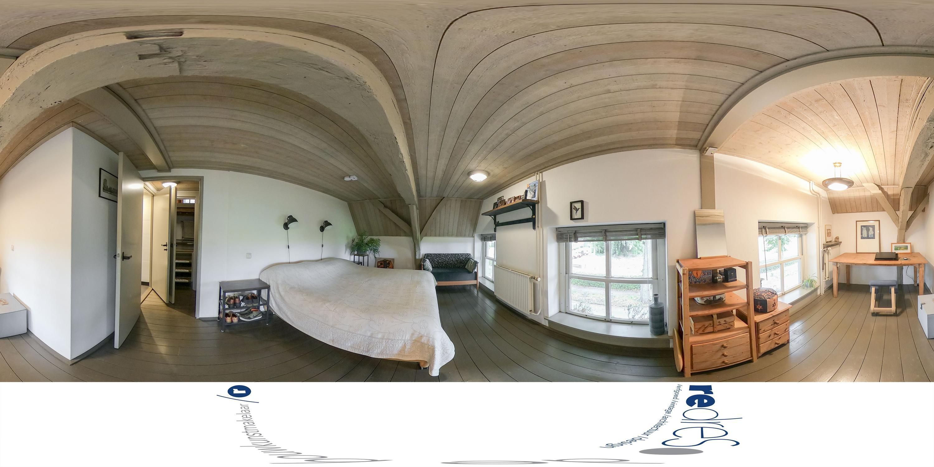 De vaste trap leidt naar de zolderkamer met dakkapel en uitzicht op de Maas en uiterwaarden. Met een hoogte van 3,83 m en de monumentale kapconstructie volledig in zicht, vormt dit een sfeervolle slaapkamer. Hier komen tweehonderd jaar bouwgeschiedenis en de filosofie van de Bossche School samen. Het is een ruimte die tegelijkertijd monumentaal en intiem voelt.