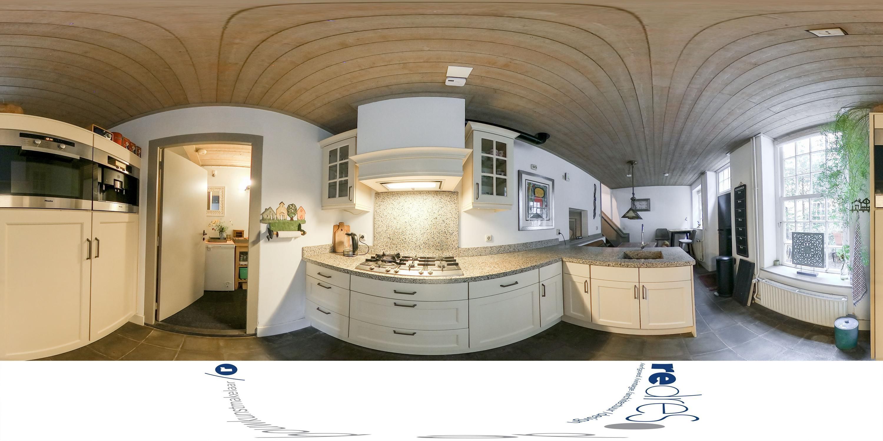 De keuken combineert koken en eten. Uitgevoerd in lichte tinten en voorzien van een terrazzo blad, 5-pits gasfornuis, afzuigkap, combi-oven/magnetron, koffieautomaat, koelkast en vaatwasser. Het eetgedeelte heeft toegang tot de besloten stadstuin, gunstig gelegen op het westen, waar 's zomers de middagzon royaal binnenvalt. Vanuit de keuken loopt men door naar de benedenhal. De keuken is ontworpen als centrale plek in huis: licht, praktisch en verbonden met binnen én buiten. Hier wordt samen gegeten en gewerkt, met zicht op de tuin en de patio.