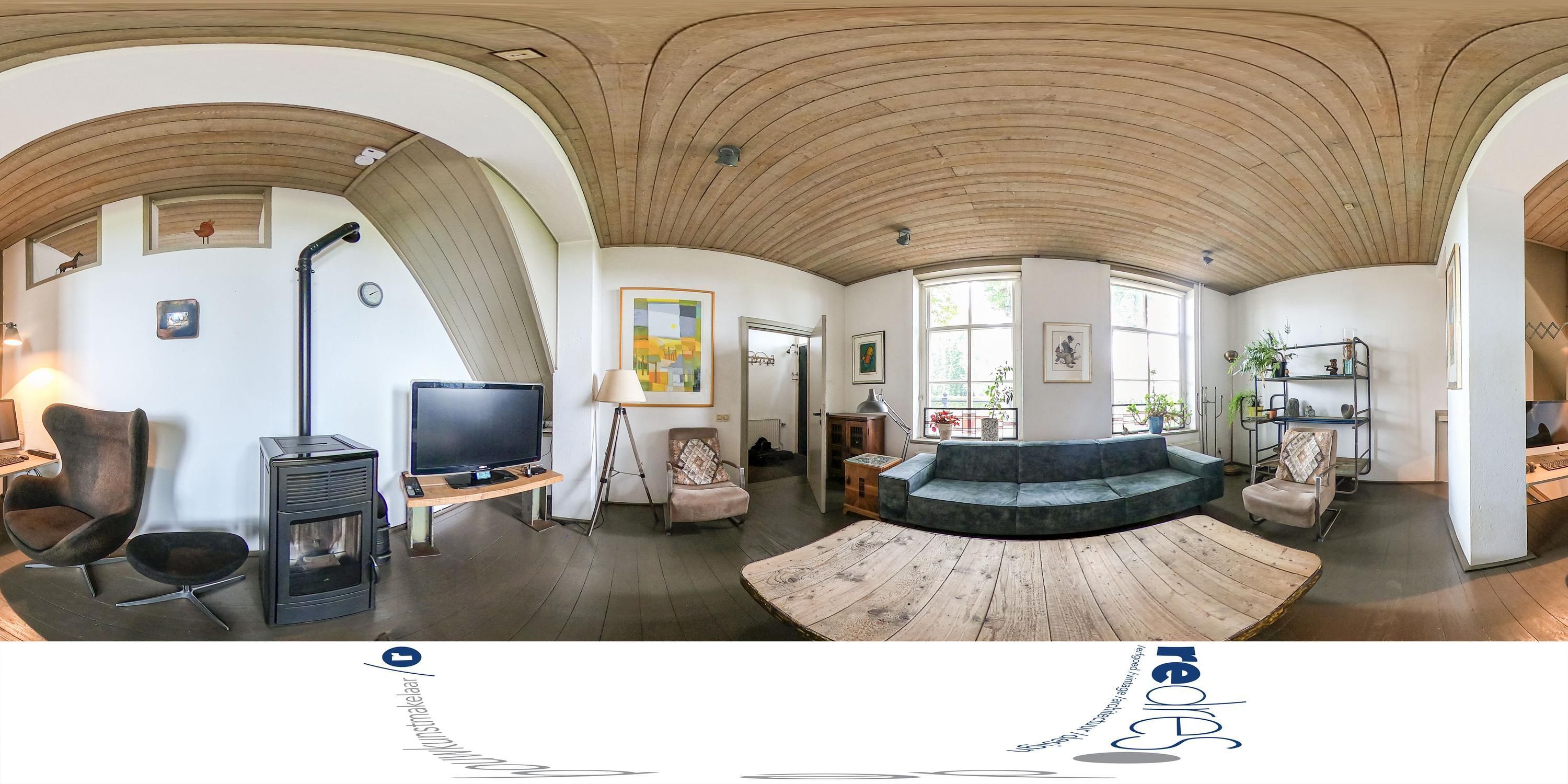 De voordeur aan de Maasdijk geeft toegang tot de bel-etage. De woonkamer (26 m², hoogte 2,98 m) ligt aan de voorzijde en biedt vrij uitzicht over de Maas en de uiterwaarden. Grote ramen en diepe neggen versterken dit panorama. Een centrale kolom ordent de ruimte en markeert de maatverhoudingen. Hier staat ook de pelletkachel. Ramen in de wand verbinden de woonkamer visueel met de logeerkamer, die via vijf treden in de hal te bereiken is. De woonkamer is meer dan een verblijfsruimte: het is een plek waar de rivier altijd aanwezig is, waar het licht van de seizoenen binnendringt en waar de ingetogen architectuur een vanzelfsprekend decor vormt voor het dagelijks leven.