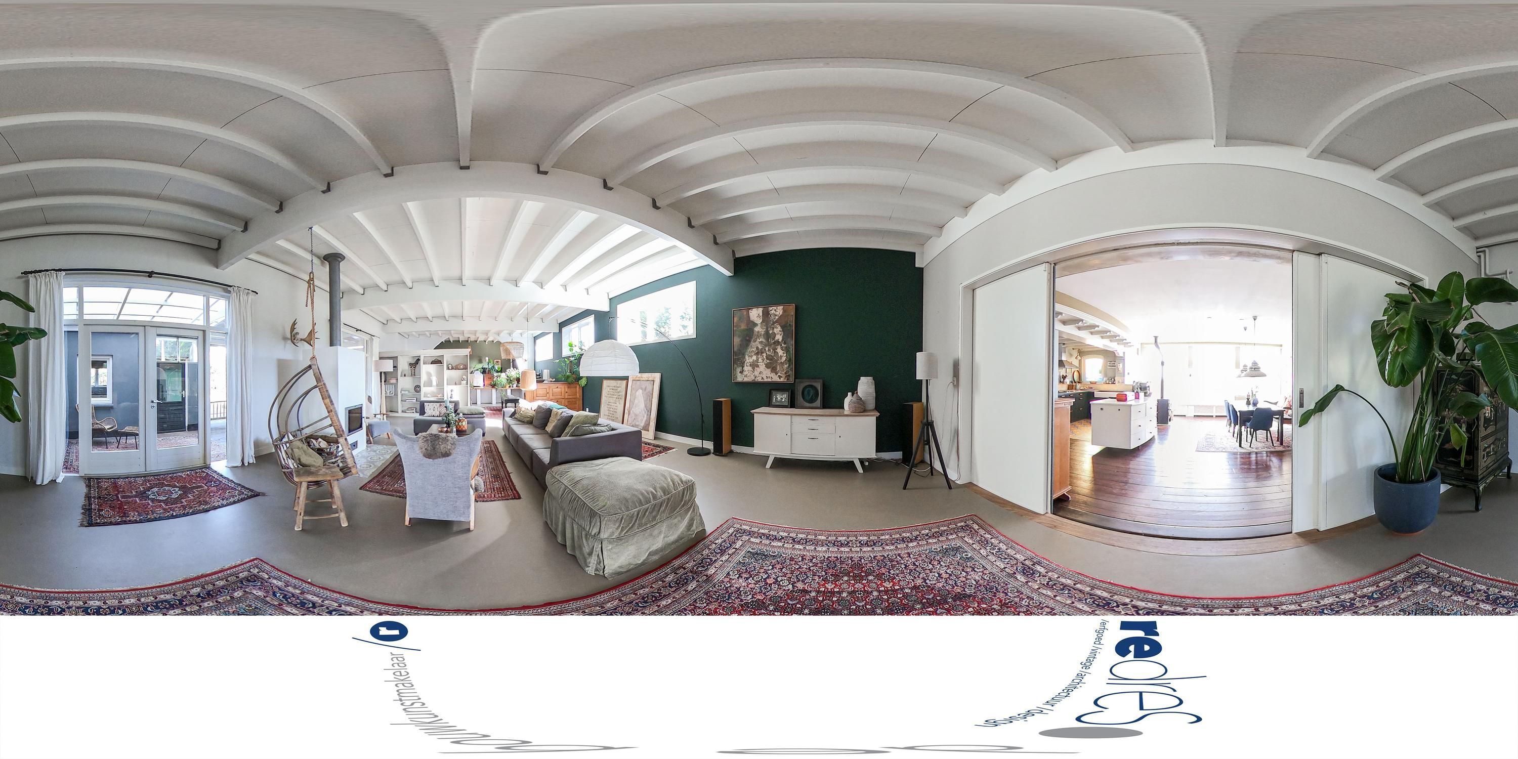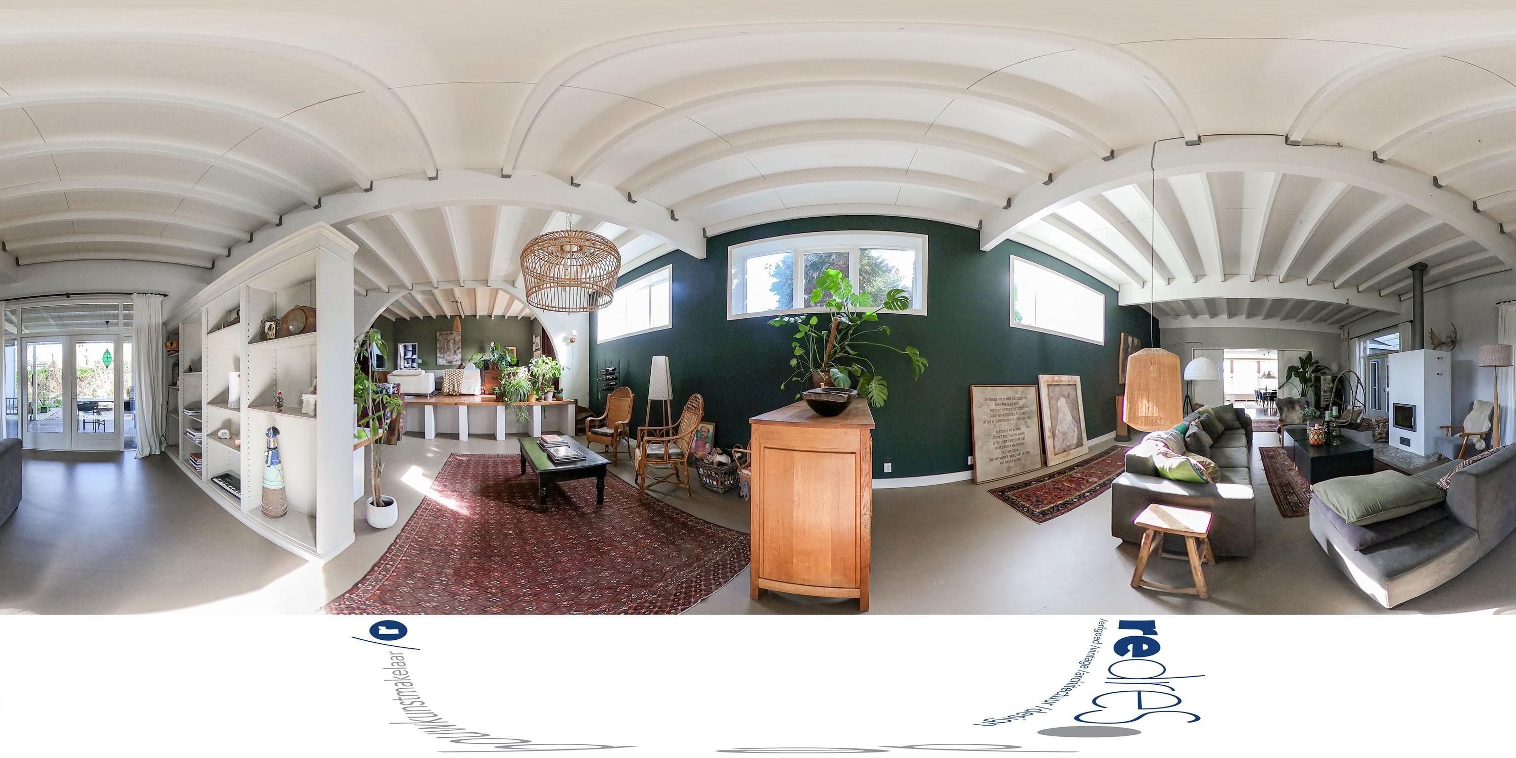 Vanuit de woonkeuken loopt de route door naar de voormalige feestzaal van circa 94 m², nu in gebruik als riante woonkamer. Dit is het centrale deel van het huis en een plek die direct overtuigt door maat en karakter. De ruimte heeft een licht industrieel karakter door de grote spanten, terwijl de gevlinderde betonvloer dit beeld versterkt en tegelijkertijd zorgt voor een duurzame vorm van verwarming. De vloer is recent geïsoleerd en voorzien van vloerverwarming.
