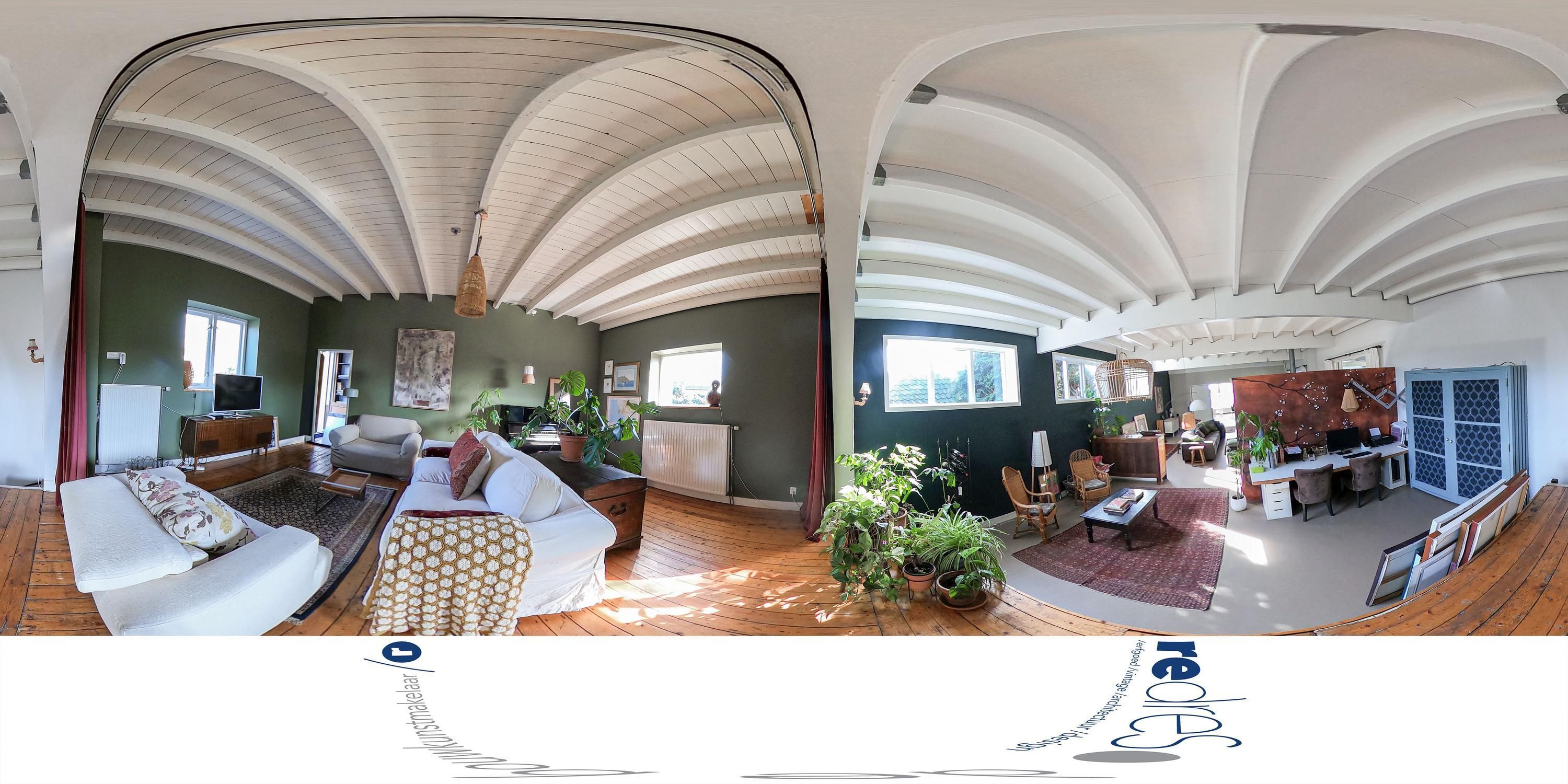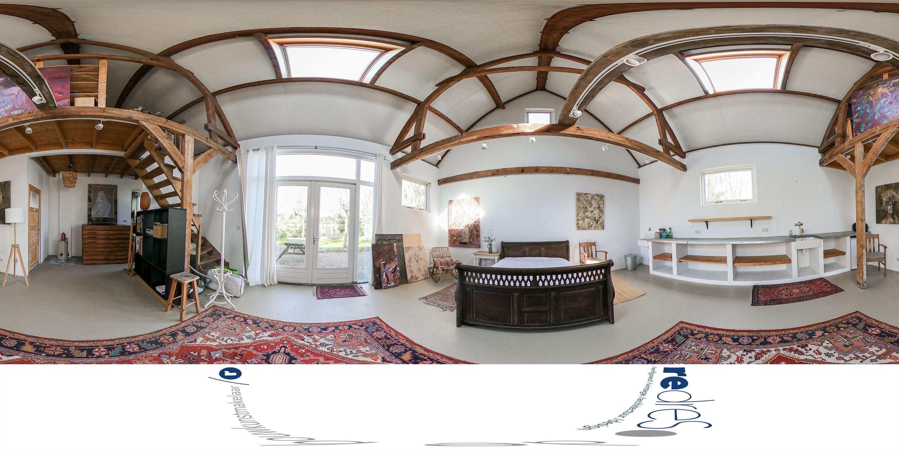 Achter het podium ligt een extra zitkamer van circa 29 m². Dit deel is meer besloten en vormt een overgang naar het achterste deel van het pand. Verder naar achteren ligt het atelier van circa 50 m². Deze ruimte heeft grote hoogte, zicht tot in de nok en een vide. De houten spanten zijn zichtbaar en het licht komt van meerdere zijden binnen.