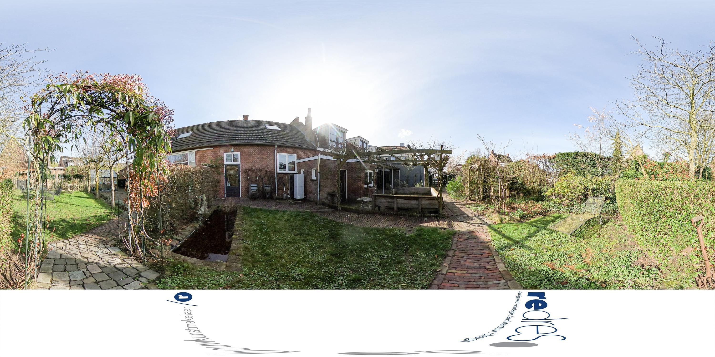Het perceel van circa 1.030 m² is diep en zorgvuldig ingericht. Direct achter het gebouw ligt een verhard erf met terrassen en pergola’s, dat aansluit op de begane grond en functioneert als verlengstuk van de woonruimten. Hier ontstaat een aangename overgang tussen binnen en buiten, beschut en bruikbaar, op een manier die goed past bij de schaal van het huis.