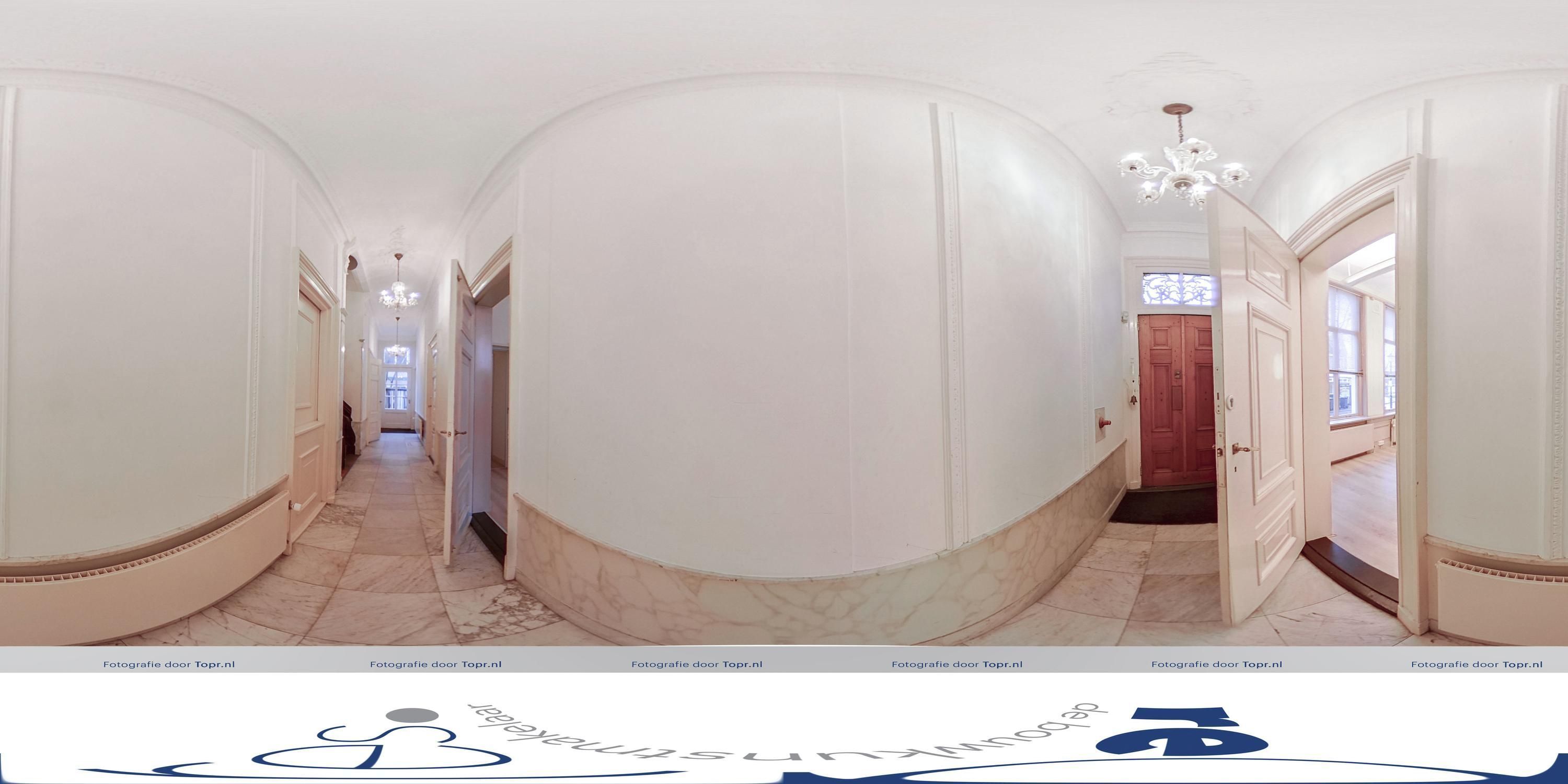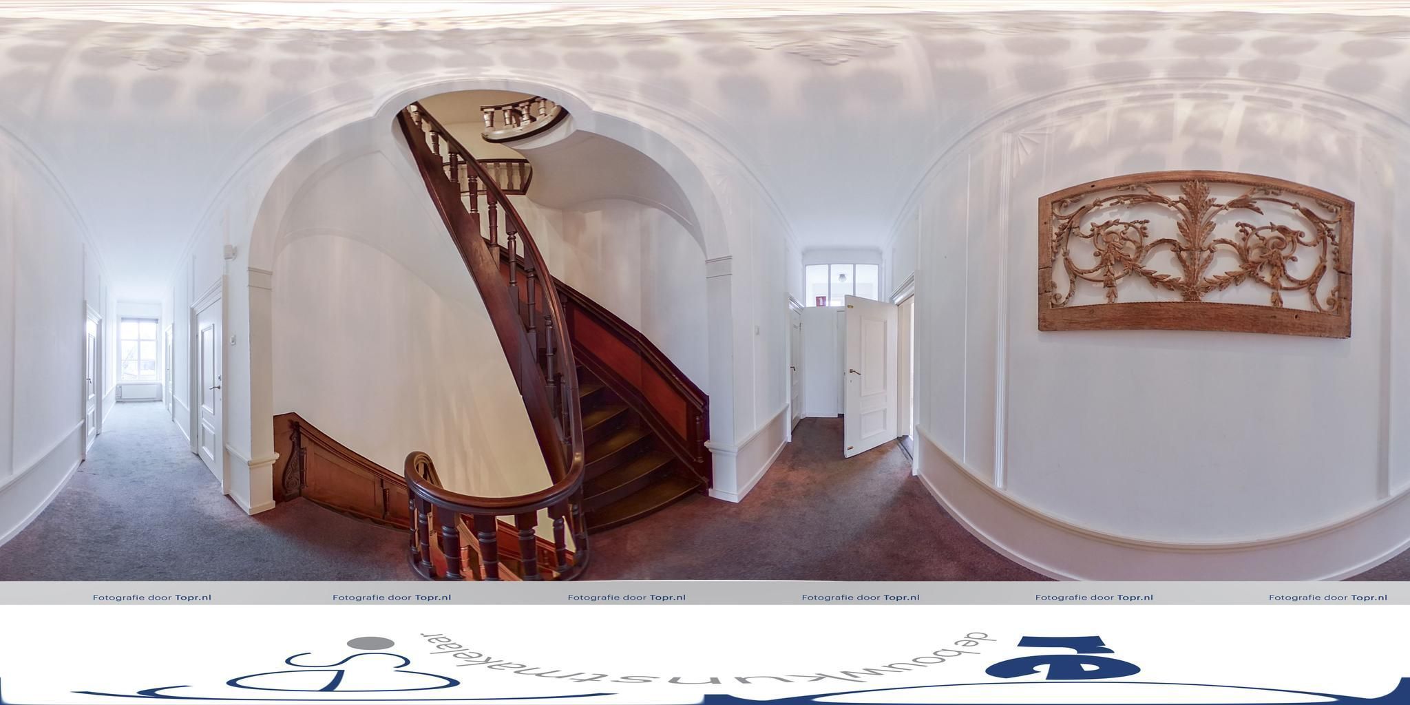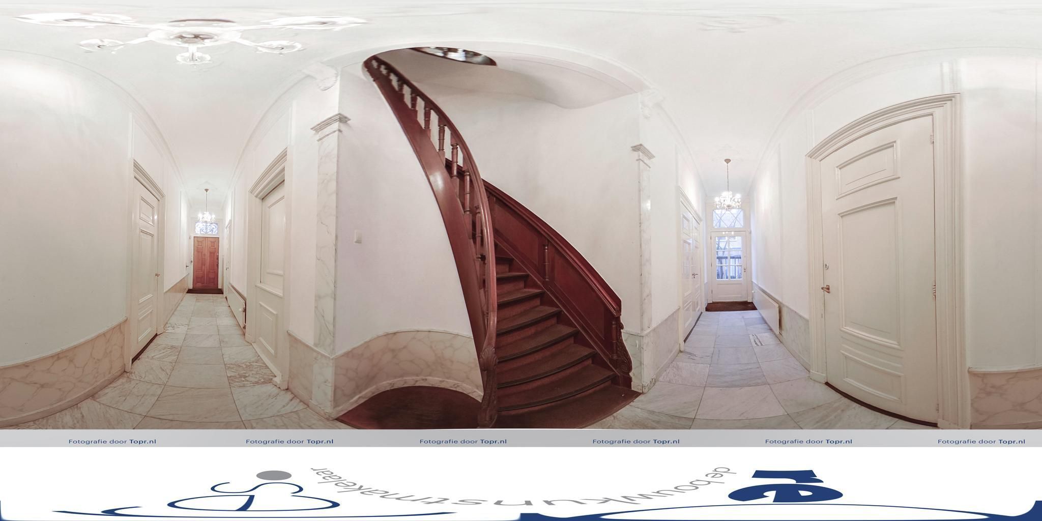 Entree in de gang op de begane grond. Deze is voorzien van witmarmeren vloer en plint, de lambrisering gemarmerd en de beëindiging weer een witmarmeren lijst. De wand daarboven is voorzien van stucversiering en het plafond eveneens met sierstucwerk. Dit stucwerk is inmiddels uiterst zeldzaam geworden in Nederland en haast van museale waarde. En dan: een blik naar boven, hangend over de trapleuning. Als een slakkenhuis krult de trap zich een weg naar boven. Dat trappen ook gewoon adembenemend mooi kunnen zijn, dat zijn we vandaag de dag een beetje kwijtgeraakt. In de grote kamers steeds sierlijke schouwen, sommige van z.g. Napoleon marmer (roze van kleur), andere in zwarte steen met sierlijke, met goud ingevulde decoraties.