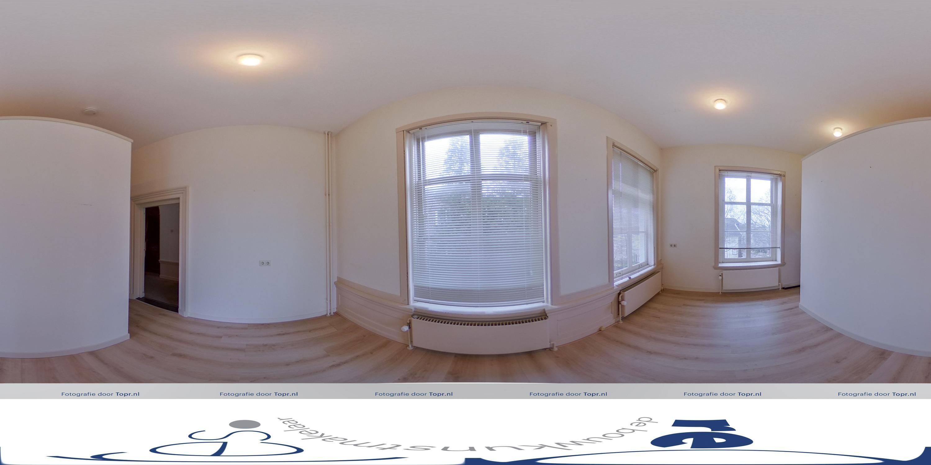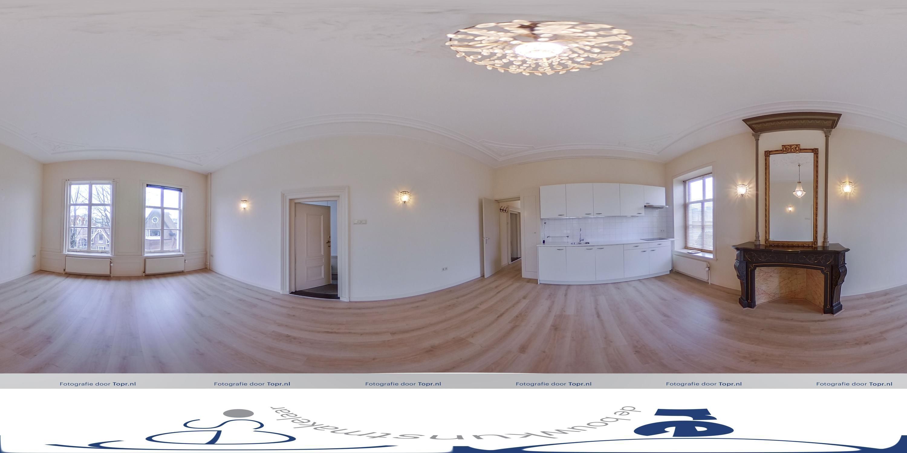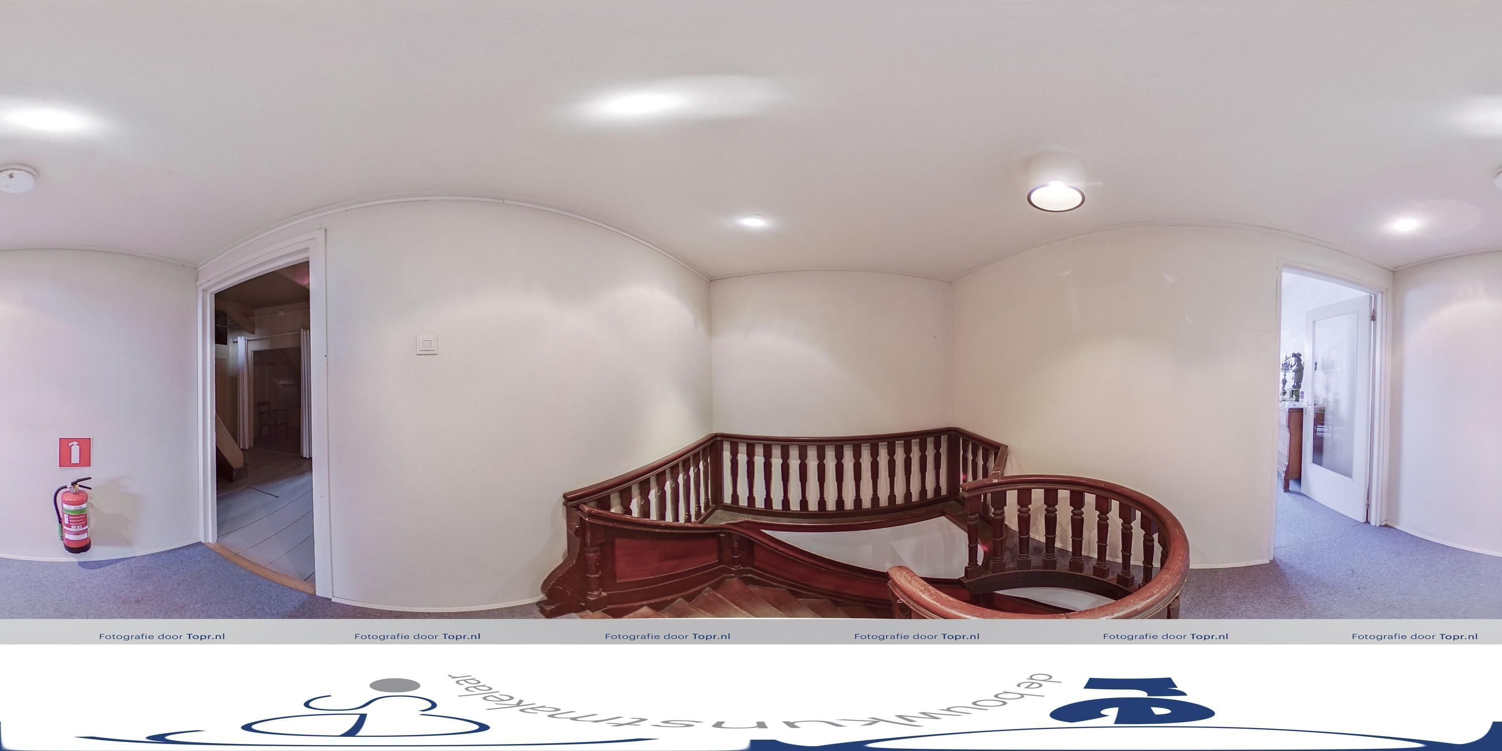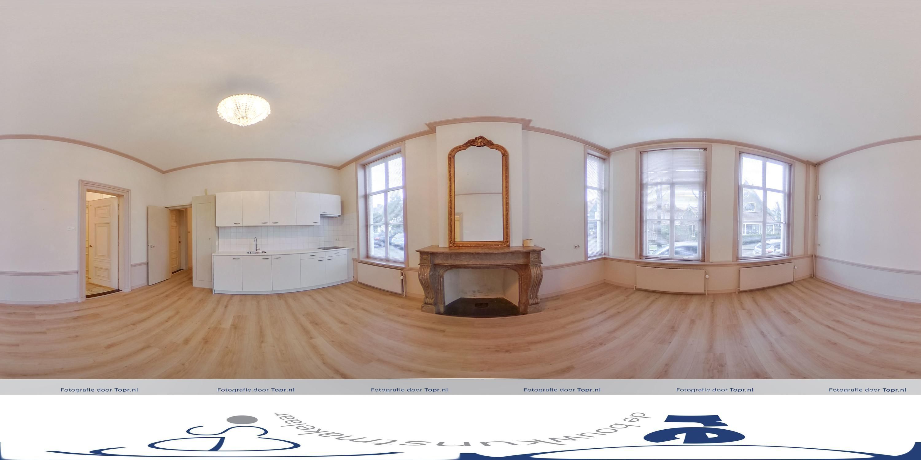 Via de prachtige monumentale trap komen we op de eerste verdieping. Deze verdieping echoot het programma van de begane grond. Wederom een lange gang in het midden en aan weerszijden een voor- en achterkamer. Op dit moment zijn dit eveneens twee ruime woonunits die beide grenzen aan de gang. Elk voorzien van een eigen keuken en badkamer. Ook hier zijn deze voorzieningen reversibel ingebouwd zodat bij een wederopstanding naar de oorspronkelijke villa deze zaken eenvoudig verwijderd en naar eigen wens aangepast kunnen worden.