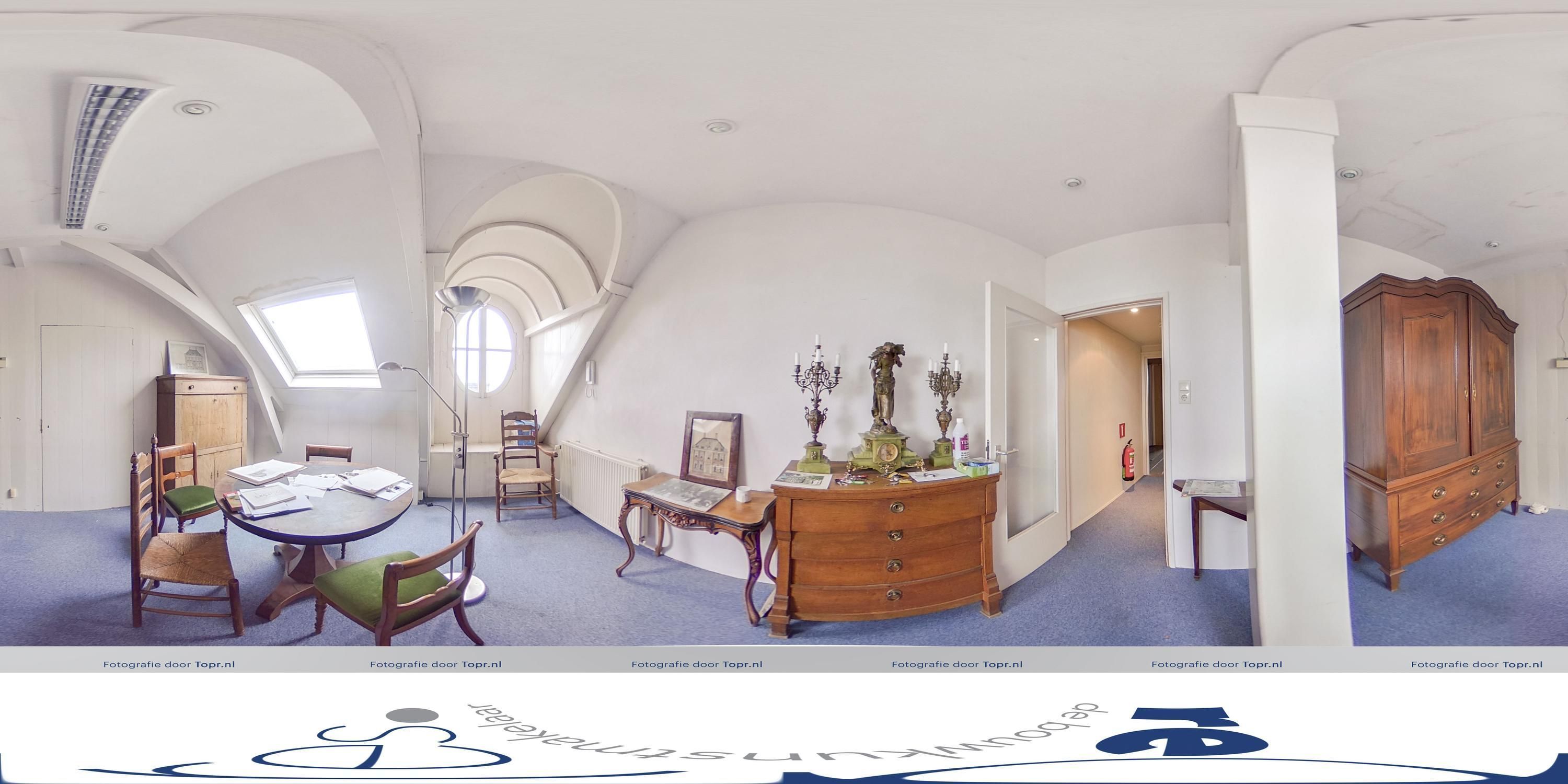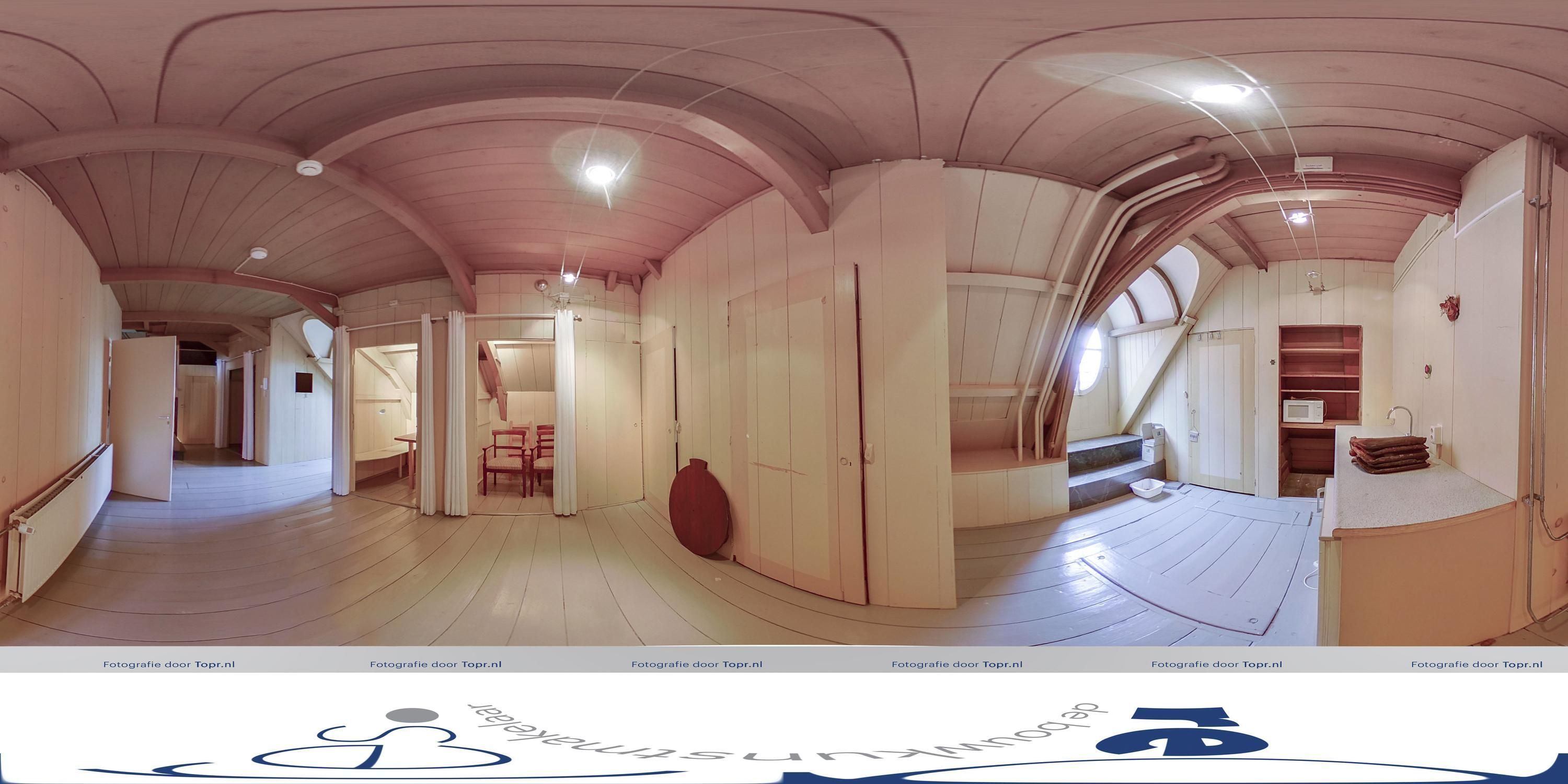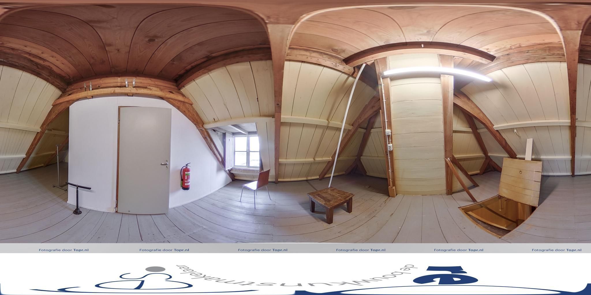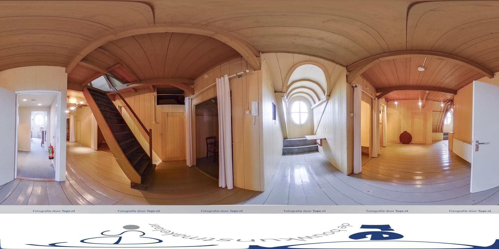 De tweede verdieping was voor het personeel, maar hoe lieflijk is dit nu: het lichte houtwerk van de vloeren, wanden en plafond geeft een ongelofelijk charmant beeld. Het is nostalgie en vandaag de dag vallen we hier languit voor. Dit is een verdieping met enorm veel mogelijkheden om bijvoorbeeld extra slaapkamers te realiseren of een gastenverblijf. De ossenogen rondom het huis bieden een fraai uitzicht en zijn een interieurelement op zich. Zelfs de trappetjes voor de ronde ramen werden geschilderd alsof het marmer was. Op zolder bevindt zich ook het stookhok, waar de ketel hangt.